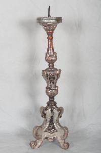 Coppia di candelieri in legno argentato. Base trapezoidale decorata da volute vegetali poggiante su piedini a ricciolo; fusto con nodo piriforme molto allungato decorato con volute e motivi vegetali; collarino e gola lisci a disco; bocciolo con teoria di foglie d'acanto nella parte di raccordo al fusto.