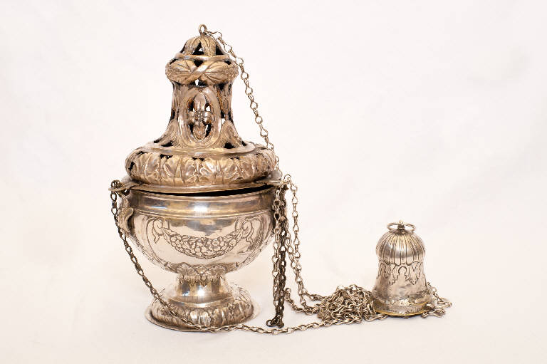 Turibolo in argento. Piede a base circolare decorato con teoria di foglie d'acanto; coppa a vaso con festoni floreali; coperchio con motivi vegetali, ovali, fiori e teorie di foglie d'acanto; piattello di raccordo delle catene con motivi baccellati e vegetali a incisione.