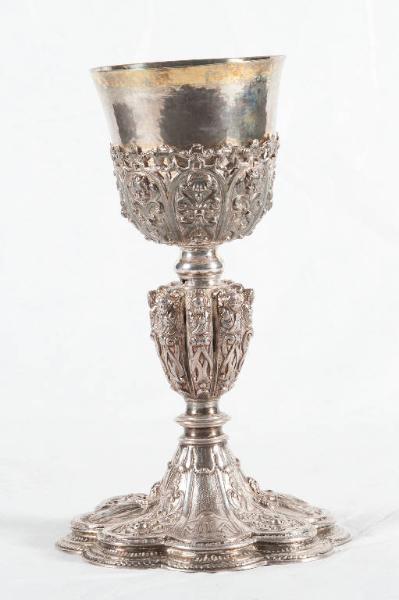 Calice in argento. Piede a forma di corolla floreale a otto petali a più gradini, ripartita da cartelle a voluta in cui si alternano la scritta "MIA", teste di cherubino e le figure della Madonna immacolata, di Gesù Bambino redentore e di S. Alessandro (?). Fusto con nodo troncopiramidale ornato da cherubini con funzione di cariatide inseriti a fascio; collarino e nodo di raccordo a rocchetto. Sottocoppa, eseguito a sbalzo, decorato con racemi vegetali e specchiature all'interno delle quali si alternano teste di cherubino, simboli del giglio e dell'ulivo.