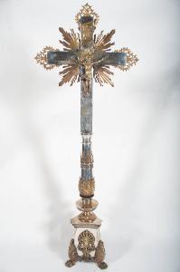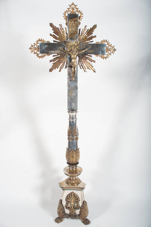 Croce d'altare argentata e dorata. Base trapezoidale con piedi a zampe leonine e decorazioni fogliacee in bronzo dorato. Fusto scandito da inserti vegetali e teorie di foglie sovrapposte in bronzo dorato con nodo molto schiacciato baccellato e dorato nella parte inferioreo. Croce raggiata d'oro con racemi vegetali in bronzo dorato nelle terminazioni. Statuetta del Cristo realizzata a fusione. Scritta "INRI" nel cartiglio.