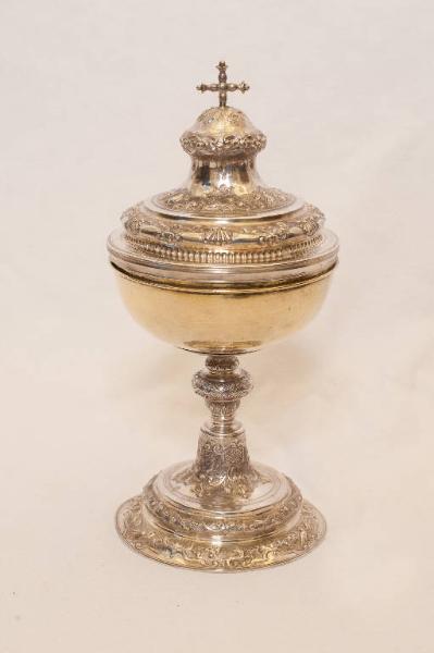 - NOTIZIE STORICO CRITICHE La pisside in esame si sviluppa su un piede circolare rigonfio ornato da racemi vegetali e valve di conchiglia eseguiti a sbalzo. Il nodo piriforme ha una decorazione a piccoli motivi vegetali. Il coperchio, invece, presenta il medesimo repertorio decorativo del piede. Il manufatto propone una tipologia piuttosto comune nella prima metà del XVIII secolo, mostrando una certa finezza nell'esecuzione del tipico repertorio decorativo dell'epoca (valve di conchiglia e racemi vegetali).