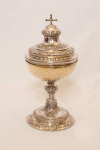 Pisside in rame argentato. Piede circolare rigonfio con racemi vegetali e valve di conchiglia a sbalzo. Fusto con nodo piriforme decorato con piccoli motivi vegetali. Coperchio con profonda strozzatura decorato con racemi vegetali e valve di conchiglia a sbalzo. Terminazione con crocetta apicale in metallo fuso.