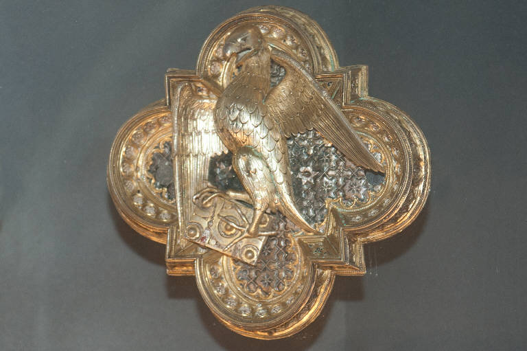 Formella quadriloba in argento con parti dorate. Al centro è raffigurata l'aquila, simbolo di San Giovanni Evangelista.