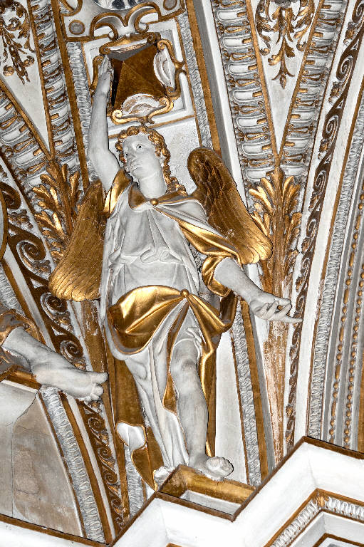 Figura di angelo in funzione di cariatide, con il braccio destro alzato.