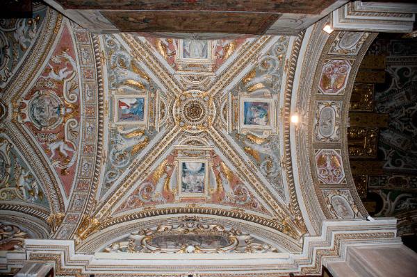 Decorazione plastica della volta della prima campata della navatella a destra del presbiterio, divisa in quattro vele da fasce decorate con motivi vegetali che s'incontrano in un rosone centrale circondato da teste di angioletto. All'interno delle vele, quattro affreschi di forma rettangolare raffiguranti episodi della vita di Gesù Cristo sono inseriti in finte ancone decorate con festoni, frutti, volute, motivi a girali e figure femminili alate.