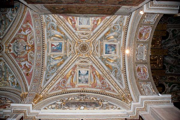 Decorazione pittorica della volta della prima campata della navatella a destra del presbiterio: all'interno di finte ancone decorate con festoni, frutti, volute, motivi a girali e figure femminili alate sono inseriti quattro affreschi di forma rettangolare raffiguranti episodi della vita di Gesù Cristo (Battesimo, Tentazione di Satana, Consegna delle chiavi a San Pietro e Trasfigurazione).