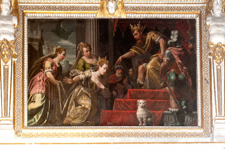 - NOTIZIE STORICO CRITICHE La tela in esame, che reca la firma del pittore, venne eseguita contemporaneamente all'opera "Giuditta con la testa di Oloferne e la spada" (num. foto 1039) posta nella lunetta a sinistra del presbiterio (Bandera, in "I pittori bergamaschi...Il Cinquecento", vol. IV, pp. 179-180, scheda 22). E' inserita in una cornice architettonica a stucco con lesene terminanti in telamoni affiancata da due grandi figure di profeti reggenti cartigli (num. foto 1036).\nCavagna raffigura l'episodio in cui Ester, giovane donna ebrea divenuta regina di Babilonia, si presenta al re Assuero perchè interceda per il suo popolo minacciato da Aman, primo ministro, che ne voleva l'eliminazione dal territorio persiano. La sequenza narrativa è ben sintetizzata: in primo piano Assuero pone sul collo di Ester lo scettro d'oro (simbolo della grazia del re); sullo sfondo l'epilogo della vicenda con il corpo di Aman che penzola dal patibolo. Interessanti risultano sia l'impasto cromatico e compositivo che derivano dalla lezione di Veronese che il preziosimo pittorico dei singoli particolari.\nL'opera è stata restaurata nel 1958 da Franco Steffanoni (cfr. "Relazione sui lavori di restauro eseguiti ai dipinti della Basilica di Santa Maria Maggiore per incarico dell'E.C.A. di Bergamo", 8 luglio 1958, protoc. 4643, cat. 89, Archivio Congregazione Misericordia Maggiore, Bergamo).