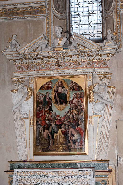 - NOTIZIE STORICO CRITICHE L'ancona fu realizzata dallo stuccatore milanese Francesco Brembilla indicativamente tra il 1578, anno in cui è attestata la sua presenza in basilica, e il 1585, anno in cui i lavori della cappella risultano conclusi e Lorenzo Porta comincia a decorarne le volte a crociera (Cortesi Bosco, in "I pittori bergamaschi...Il Seicento", vol. II, p. 94, nota 6). Al centro è collocata l'opera "Cristo e la gloria di Ognissanti" (num. foto 752) che Antonio Boselli dipinse nel 1514.\nNegli stessi anni il Brembilla realizzò l'ancona della cappella di San Giovanni nella navatella a sinistra del presbiterio (num. foto 762).