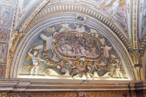 Decorazione plastico-pittorica della lunetta destra della prima campata della cappella di S. Marco: due angioletti reggono un grande cartiglio decorato con festoni e testina d'angelo. All'interno un affresco di forma ovale raffigurante la strage degli Innocenti. In alto, entro un cartiglio più piccolo, una figura femminile.