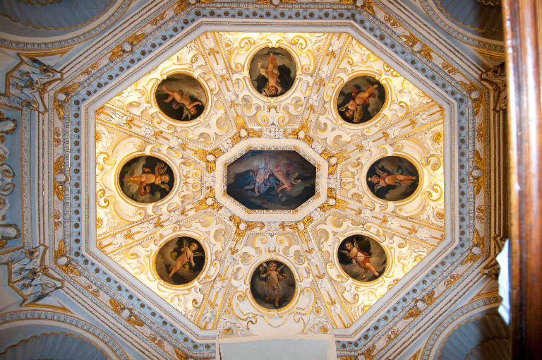 Decorazione plastica della volta della sacrestia aggiunta, divisa in otto vele da fasce decorate con festoni e testine d'angelo che s'incontrano in un ottagono centrale all'interno del quale è raffigurata una coppia di angioletti. Nelle vele sono inserite otto tele raffiguranti angeli con simboli.