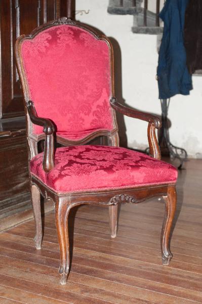 Serie di dieci sedie in legno di noce: gambe leggermente arcuate; braccioli terminanti a ricciolo; schienale inclinato ornato in alto da un motivo vegetale ad intaglio; seduta e schienale in seta damascata di color rosso.