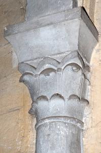 Capitelli di colonna in pietra arenaria scolpita; motivo decorativo a doppia teoria di foglie d'acqua estroflesse in disposizione sfalsata.
