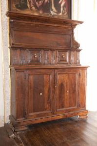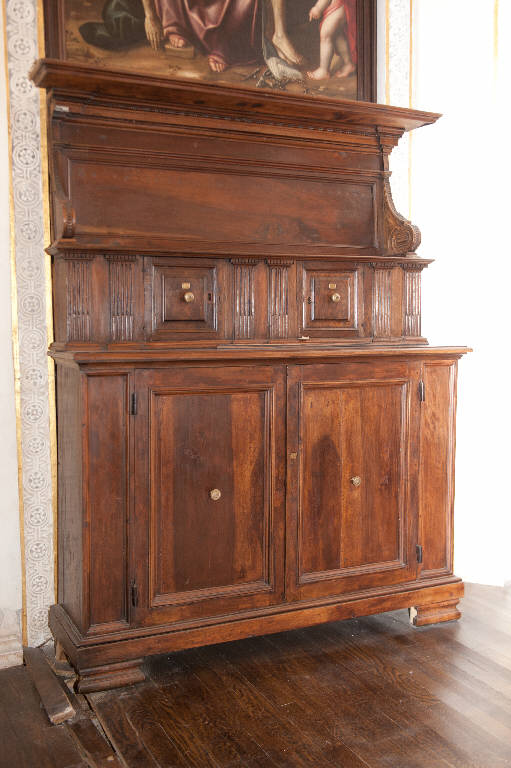 Mobile da sacrestia in legno di noce con alzata. La base costituita da due ante con cartelle modanate poggia a terra tramite l'utilizzo di piedini; il corpo centrale costituito da due antine quadrate è decorato da lesene scanalate terminanti con motivo a dentelli; l'alzata è decorata lateralmente da motivi vegetali e volute schiacciate.