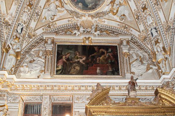 - NOTIZIE STORICO CRITICHE La decorazione della lunetta in esame fu realizzata tra il 1590 e il 1593 da Lorenzo Porta, stuccatore originario di Osteno sul lago di Lugano la cui presenza in basilica è attestata sin dal 1582. Con ogni probabilità, seguì le indicazioni, e forse i disegni, del grande decoratore milanese Francesco Brembilla e dell'architetto del Duomo Martino Bassi. (Cortesi Bosco, in "I pittori bergamaschi...Il Seicento", vol. II, pp. 92-94, nota 6). Al centro della lunetta una cornice architettonica con lesene terminanti in telamoni decorata con motivo geometrico a cerchi, motivo vegetale e teoria di ovoli racchiude la tela "Ester e Assuero" dipinta da Giovan Paolo Cavagna tra il 1593 e il 1594 (num. foto 1037).