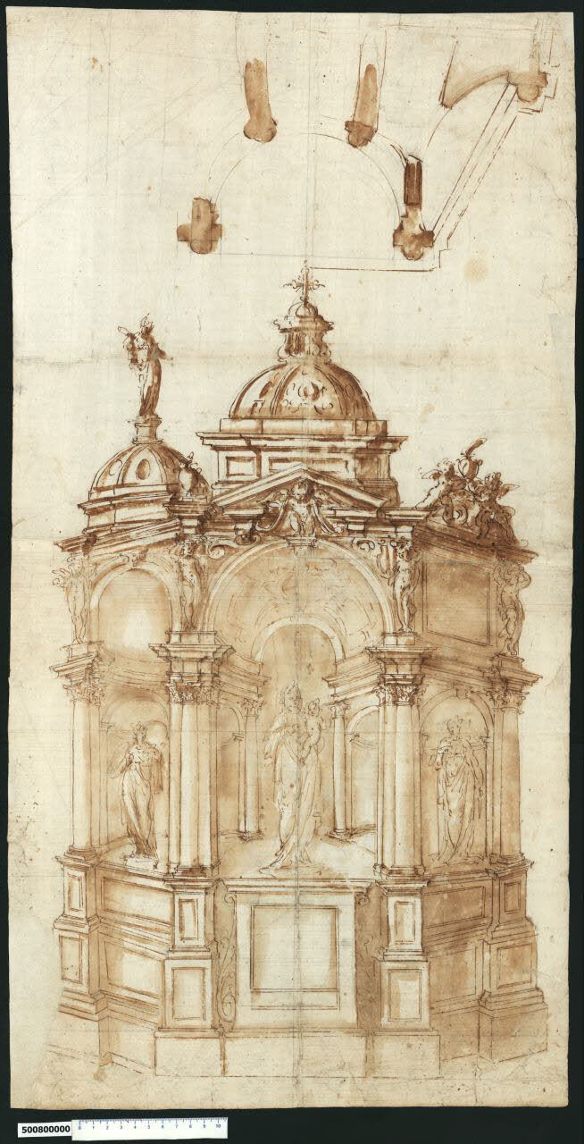 - NOTIZIE STORICO CRITICHE Nell'"Indice de due Tomi d'Intagli Tempietti ed altro", relativo ai tomi V e VI e compilato dal collezionista Giacomo Sardini, il disegno viene iscritto, insieme ad un altro contiguo, nel paragrafo "altari diversi", enunciato utilizzato anche come definizione dei disegni "7.8.". L'attribuzione del disegno a Giovanni Battista Montano fatta da Valeria Pracchi (1991, 2a parte) su segnalazione di Anna Bedon, è confermata dalla Fairbairn che però lo individua come tabernacolo (1998, p. 771). Il foglio mostra l'assonometria e la pianta parziale di un altare impostato su un alto basamento a tre fasce, con angoli aggettanti, in corrispondenza dei quali si sviluppano pilastri con semicolonne addossate reggenti tronchi di trabeazione. La parte centrale dell'altare è articolata con una grande nicchia semicircolare contenente la statua della Vergine col Bambino, il cui profondo vano interno comunica, tramite archi, con gli spazi laterali. Per questi ultimi l'autore presenta due soluzioni: a sinistra viene riproposta la nicchia con statua e vano retrostante, mentre a destra, la nicchia si limita a una rientranza della parete. In corrispondenza degli angoli, sopra la trabeazione, vengono inserite delle statue che inquadrano a sinistra e al centro i grandi archi delle nicchie - sopra i quali sono posti rispettivamente un tamburo con cupola e un timpano triangolare con cherubino inginocchiato -, mentre a destra delimitano un settore di parete con semplice specchiatura, sopra il quale è collocato un gruppo scultoreo. Al centro, a conclusione della costruzione, è inserito un tamburo che regge una piccola cupola con lanterna ornata da volute. La soluzione compositiva delineata ripropone schemi e ornamenti tipici del repertorio di Montano, riscontrabili in altri suoi disegni, tre dei quali conservati in Milano, Collezione Sardini Martinelli inv. 4,51; 5,1; 5,7, altri in parte pubblicati da G. B. Soria nell'opera "Tabernacoli diversi, nuovamente inventati da M. Giovanbatista Montano milanese ..." data alle stampe nel 1628.