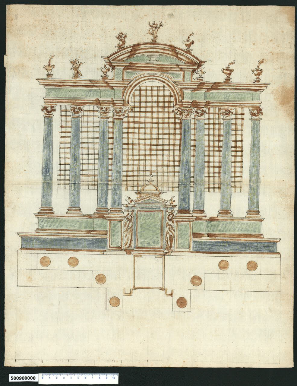 disegno in scala che conserva tracce della preliminare costruzione a grafite; è eseguito a inchiostro bruno a penna, principalmente con tiralinee, compasso e mano libera nelle parti ornamentali; campiture di acquerello verde e blu evidenziano gli elementi strutturali del prospetto; le ombreggiature e i dettagli sono precisati con acquerellature di inchiostro bruno; il supporto sul quale è tracciato è di carta avorio