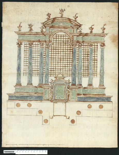 - NOTIZIE STORICO CRITICHE Nell'"Indice de due Tomi d'Intagli Tempietti ed altro", relativo ai tomi V e VI e compilato dal collezionista Giacomo Sardini, il disegno viene iscritto nel paragrafo "Case loro parti" con la definizione "9 Voliera". Il disegno è attribuito a Giovanni Battista Montano da Valeria Pracchi (1991, 2a parte) su segnalazione di Anna Bedon, mantenendo l'identificazione di "voliera" data da Sardini. In realtà il foglio mostra il prospetto e la pianta di un altare addossato ad una parete munita di grata, particolare che rimanda ad un contesto claustrale. L'altare è composto da un basamento sul quale sono appoggiate otto colonne con trabeazione ornata da lampade e statue. In corrispondenza della parte centrale, la struttura avanza ad inquadrare il tabernacolo; in questo punto i capitelli delle colonne presentano il lato interno ornato da una testa alata di cherubino di dimensioni maggiori, che funge da imposta per un arco sormontato da un timpano curvilineo. Il tabernacolo, affiancato da due angeli, ha la forma di un tempietto con frontone triangolare e cupola. La soluzione compositiva delineata risulta eccentrica rispetto al repertorio tipico di Montano, non sono stati individuati altri esempi che si possano accostare al presente.