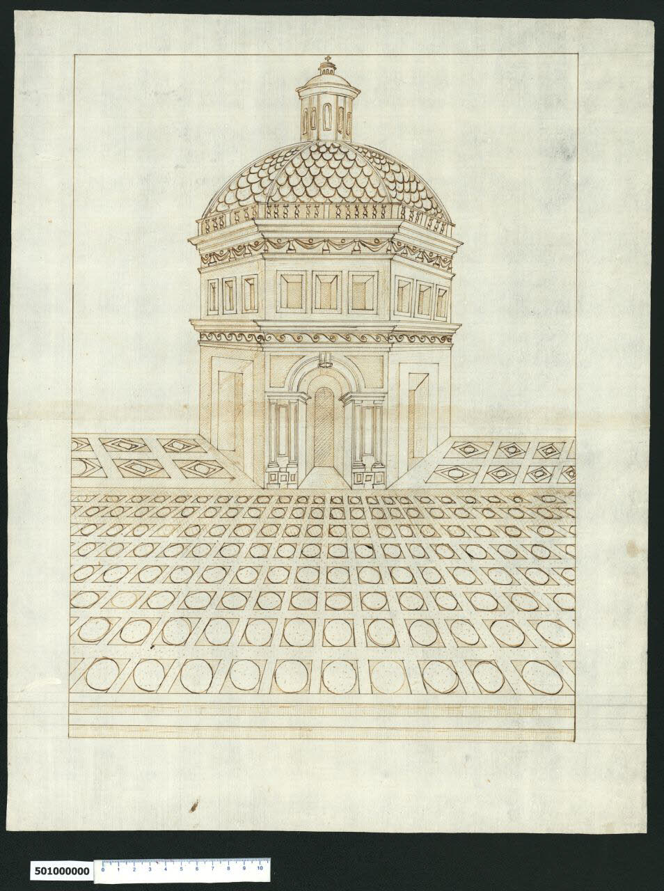 - NOTIZIE STORICO CRITICHE Nell'"Indice de due Tomi d'Intagli Tempietti ed altro", relativo ai tomi V e VI e compilato dal collezionista Giacomo Sardini, il disegno viene iscritto nel paragrafo "Tempietti" con la definizione "10 a cupola in prospettiva". Il disegno, che non è stato possibile identificare, raffigura la prospettiva di una chiesa a pianta ottagonale o esagonale prospettante su una piazza con pavimentazione a motivi geometrici. L'edificio presenta un primo ordine caratterizzato da tre portali, quelli laterali hanno l'apertura contornata da un semplice profilo, mentre quello centrale presenta lesene binate su piedistallo che reggono una cornice sopra la quale si imposta direttamente la ghiera dell'arco decorata con una mensola in chiave. Un fregio a cane corrente separa questo primo livello dal secondo articolato con tre aperture rettangolari su ogni lato dell'edificio. Superiormente corre un fregio ornato da balaustrini reggenti panneggi, sopra il quale si sviluppa una cornice a tre fasce che funge da basamento per la balaustra terminale. Sopra la cupola è ubicata una lanterna poligonale. La tipologia delle tegole della cupola, il tratteggio utilizzato per rendere le ombre, e certe soluzioni compositive, portano a supporre che l'autore fosse a conoscenza della produzione grafica di inizio Cinquecento, confluita in album come quello della Collezione Destailleur-Rothschild conservata al Louvre, in particolare i disegni DR 1438, 1441, 1444, 1445, 1448.