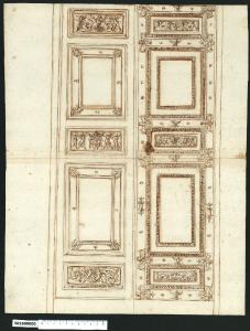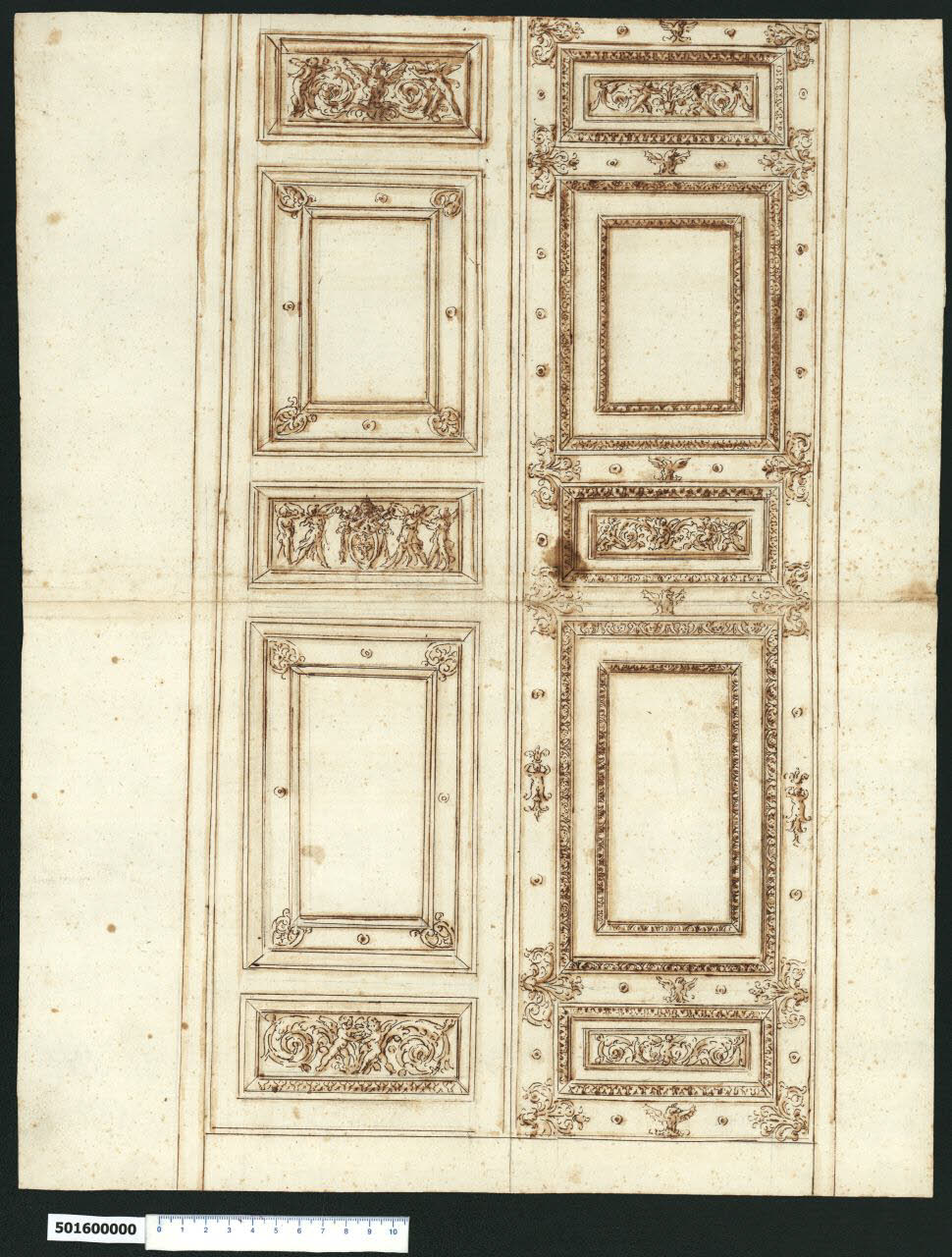 - NOTIZIE STORICO CRITICHE Nell'"Indice de due Tomi d'Intagli Tempietti ed altro", relativo ai tomi V e VI e compilato dal collezionista Giacomo Sardini, il disegno viene iscritto nel paragrafo "Porta" con la definizione "16 altra d.a" [si legga: imposta]. L'attribuzione del disegno a Giovanni Battista Montano fatta da Valeria Pracchi (1991, 2a parte) su segnalazione di Anna Bedon, è confermata dalla Fairbairn (1998, n. 1011; p. 771). Il foglio raffigura una porta ornata con gli emblemi di Paolo V Borghese, l'aquila e il drago, per il quale, così come per altri della Collezione Sardini Martinelli, la paternità montaniana è messa in dubbio da Gonzalez Palacios (2004, p. 17). La porta è divisa in due battenti, per i quali sono proposte soluzioni alternative, articolati con due specchiature grandi disposte verticalmente, alternate a tre più piccole orizzontali. Nell'anta di sinistra i pannelli più grandi mostrano cornici interne ed esterne lisce, raccordate agli angoli da cuori vegetali, mentre quelli più piccoli presentano, dall'alto verso il basso, un drago con girali e angeli, lo stemma papale di Paolo V retto da coppie di angeli e, infine, girali con al centro due putti abbracciati. Nell'anta di destra l'autore crea una cornice con decorazioni floreali e borchie, e inserisce le insegne di Paolo V negli spazi che separano i pannelli verticali, provvisti di cornici intagliate, da quelli orizzontali. In questi ultimi ricorre il motivo dei girali con putti. Il presente disegno costituisce una variante di quello conservato in Milano, Collezione Sardini Martinelli inv. 5,11.