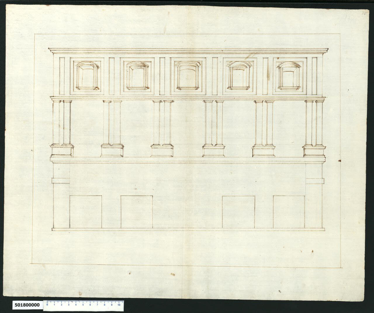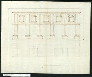 - NOTIZIE STORICO CRITICHE Nell'"Indice de due Tomi d'Intagli Tempietti ed altro", relativo ai tomi V e VI e compilato dal collezionista Giacomo Sardini, il disegno viene iscritto nel paragrafo "Banchi" con la definizione "18 Schizzo".\nIl disegno, contrariamente a quanto affermato da Sardini, sembra raffigurare la facciata di un palazzo su tre livelli, di altezza digradante verso l'alto, e divisi da marcapiani le cui fattezze ricordano palazzo Stati Maccarani a Roma. Questo palazzo fu restaurato da Giulio Romano tra il 1519 e il 1524. Non è possibile stabilire con certezza la tipologia del disegno, anche se si ipotizza possa essere un disegno dal vero, di apprendimento accademico, non completato. La grafia è incerta e non è possibile individuare l'autore probabilmente appartenente all'ambito romano a cavallo tra XVI-XVII secolo.\nNella parete, liscia nella parte bassa perché manca la finitura in bugnato e priva del portale con montanti e frontone triangolare pure a bugnato, si aprono quattro botteghe. Al primo piano nobile la facciata è ripartita in cinque campiture da sei lesene doriche binate con basamento comune, ma mancano le finestre a timpani arcuati e triangolari alternate presenti nel palazzo. Il piano superiore, più definito, presenta una serie di riquadrature individuate da fasce verticali lisce, unificate dalla fascia superiore e da quella più stretta inferiore, al centro delle quali si trovano aperture ad arco ribassato rappresentate in prospettiva.