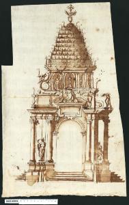 - NOTIZIE STORICO CRITICHE Nell'"Indice de due Tomi d'Intagli Tempietti ed altro", relativo ai tomi V e VI e compilato dal collezionista Giacomo Sardini, il disegno viene iscritto nel paragrafo "Machine da Funerali" con la definizione "20 con statue".\nIl disegno presenta il progetto per un catafalco a forma di tempietto, in due versioni rispetto alla mezzeria. Questo tipo di apparato funebre effimero si è sviluppato in Roma nella seconda metà del XVI secolo. Gli esempi più noti sono: il Catafalco per il cardinale Alessandro Farnese, costruito nel 1589 sotto la cupola della chiesa del Gesù da Girolamo Rainaldi (che ne fece una descrizione dettagliata) o forse più probabilmente dal suo maestro Domenico Fontana, su modello del tempietto di San Pietro in Montorio; il Catafalco per Sisto V, costruito nel 1591 da Domenico Fontana con Giovanni Guerra in Santa Maria Maggiore, la cui cupola richiama quella di San Pietro in Vaticano; il solenne Catafalco per Paolo V (1622) costruito nella Basilica di S. Maria Maggiore su idea di Sergio Venturi e quello per il principe Carlo Barberini, fratello di Urbano VIII, realizzato nel 1630 su progetto di Gian Lorenzo Bernini, in cui la struttura architettonica razionalmente strutturata è subordinata alla decorazione scultorea (cfr. M. Fagiolo, Atlante tematico del Barocco in Italia, Roma 2007).\nIl Catafalco qui rappresentato, è una sorta di tempietto a pianta quadrata aperto, accessibile dai quattro lati attraverso scalinate inserite nel massiccio basamento. La parte centrale di ingresso, comune alle due varianti, presenta un arco impostato su piedritti con cornici sporgenti, il cui contorno termina al centro con un cartiglio in due volute che sorregge una riquadratura sagomata per iscrizione, protetta da un frontone curvilineo spezzato, al centro del quale si trova uno stemma gentilizio con corona sorretta da due putti alati (elemento codificato da C. Fontana e ripreso da G. A. De Rossi). Sul lato sinistro è prevista una struttura più imponente con una coppia di colonne ioniche di cui l'idea di posizione su piani leggermente sfalsati è data dalle ombreggiature che si susseguono lungo il basamento e le cornici sagomate soprastanti. Tra di esse è posta una statua di figura femminile in posizione frontale su piedistallo, con il braccio alzato a sostenere il drappeggio dell'abito. Sopra l'articolato e sporgente cornicione della trabeazione è un alto basamento di sostegno alla copertura, circondato da candelabri accesi. La copertura, impostata su un tamburo ad archi sostenuto da imponenti volute ornate da un putto alato e portacandele, è di forma conica gradonata, completamente ricoperta di candele accese e arrotondata in cima, dove si erge un globo con un drago sovrastato da una croce trilobata. Questo elemento potrebbe simboleggiare il male vinto dal bene, ma il drago potrebbe anche essere l'emblema di un membro della famiglia Borghese, cui sarebbe dedicato il catafalco.\nL'ipotesi progettuale di destra, più snella, limita la struttura muraria appena oltre la prima colonna ionica a ridosso dell'arco di ingresso e sposta sul fronte laterale la seconda colonna, sopra la quale la trabeazione sporgente corre libera da sovrastrutture, fungendo unicamente da sostegno per una statua d'angelo e una voluta che fa da contrafforte al corpo su cui si erge la copertura. Su questo lato il tamburo è risolto con aperture pure arcuate, ma inframmezzate da colonnine e con al centro candelieri accesi. La figura femminile tra le colonne alla base è qui vista lateralmente, mentre sopra il cornicione frontale, a lato del frontone curvilineo, si erge un'altra statua femminile drappeggiata, in sostituzione del candeliere proposto nella stessa posizione nella versione di sinistra.\nOltre all'immagine di "tempietto" e "mausoleo", l'apparato richiama quella di "baldacchino" (emulante quello beniniano), elemento glorificante che veniva impiegato per esaltare la figura di un papa o di un monarca nei cortei rituali, usato quindi anche per le esequie dei pontefici, o di "padiglione" e "tabernacolo", ultimo presidio per il defunto e insieme elemento di gloria, simbolo come il ciborio della cupola celeste.\nUn'altra immagine evocativa è quella della "pira ardente" per la presenza delle numerose candele sulla copertura. Esempi di questa tipologia si ritrovano in apparati funebri realizzati sempre dalla seconda metà del XVI secolo nella chiesa di San Lorenzo a Firenze, dove le coperture sono similmente gradonate e cariche di candele allineate (cfr. A. Petrioli Tofani, La scena ecclesiastica, in AA.VV, Il potere e lo spazio. La scena del Principe, Firenze 1980, pp. 385-392).\nL. Fairbairn attribuisce il disegno a Giovanni Battista Montano (Fairbairn, 1998 vol. II, Appendix 8, p. 770); V. Pracchi, che attribuisce il disegno in forma dubitativa a questo autore su segnalazione di A. Bedon, rileva la somiglianza con il catafalco sopra citato realizzato per le esequie di Paolo V (Pracchi, 1991 pp. 11, 14), ma non è stato trovato riscontro.
