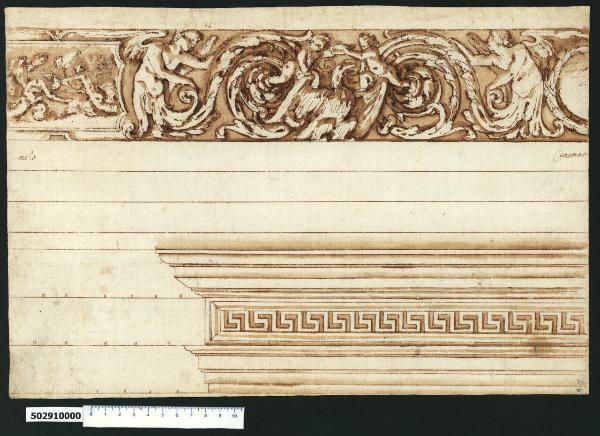 - NOTIZIE STORICO CRITICHE Nell'"Indice de due Tomi d'Intagli Tempietti ed altro", relativo ai tomi V e VI e compilato dal collezionista Giacomo Sardini, il disegno viene iscritto, insieme ad altri in parte non contigui, nel paragrafo "Ornati" con la definizione "182 59 62 28 Fregio". Il disegno è attribuito a Giovanni Battista Montano da Valeria Pracchi (1991, 2a parte) su segnalazione di Anna Bedon. Il foglio mostra studi per un fregio a grottesche e per la trabeazione di una porta. Il fregio si sviluppa secondo una sequenza che, da sinistra verso destra, mostra un riquadro con profilo sagomato, seguito da una grottesca con angeli, girali e putti che stanno incoronando un'aquila, e si conclude a destra con una corona di lauri raffigurata per metà. Sotto il fregio sono scritte due parole "mezo" e "cantonat", forse riferite alla posizione dei settori decorativi all'interno della parete. La trabeazione presenta un architrave a tre fasce aggettanti, un fregio a meandro e una cornice a più fasce separate da listelli. Il disegno riprende, in particolare per quanto riguarda il fregio, un tema caro a Montano, per il quale ci ha lasciato numerosi esempi soprattutto nelle tavole della "Regola de li cinque ordini di architetura", data alle stampe nel 1636. I disegni per quest'opera furono eseguiti probabilmente tra il 1610 e il 1615, come dimostrerebbe un disegno dell'album degli ordini conservato al Sir John Soane's Museum, recante la data 1611 (Rodriguez Ruiz, 1991, p. 79).