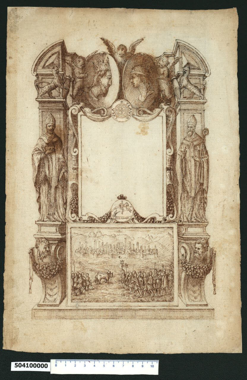 - NOTIZIE STORICO CRITICHE Il disegno iscritto nell'"Indice de due Tomi d'intagli ed altro" compilato dal collezionista Giacomo Sardini al paragrafo "Carozze e carette" con la definizione "39 altro d.o" [si legga: cielo di dentro] non corrisponde al foglio in esame forse inserito in sostituzione del preesistente con diverso soggetto.\nGli emblemi e le decorazioni che caratterizzano questo disegno, consentono di identificarlo come appartenente all'ambito lucchese. Non è chiaro a cosa potesse servire l'elaborata cornice qui raffigurata che circonda una campitura probabilmente disposta per una iscrizione o un dipinto. Potrebbe trattarsi tanto di un monumento funerario, quanto di un'opera grafica per un frontespizio.\nLa composizione, rappresentata in prospettiva, è impostata su una pedana ed è costituita da una struttura laterale sostenuta da due mensole a voluta, circondate da ghirlande di frutti con drappo laterale e da cui emergono frontalmente i volti di due vecchi barbuti. I loro visi sono rivolti verso un quadro posto sulla pedana tra le due mensole, che raffigura due gruppi di persone, rappresentanti presumibilmente a sinistra dei contadini con i buoi e sulla destra dei soldati recanti armi e vessilli, che si muovono verso la città di Lucca, cinta da mura e ricca di torri che si stagliano davanti alle montagne sullo sfondo. Le volute sostengono due mensole sagomate su cui sono poste le statue di due vescovi (recanti le scritture e il pastorale), che affiancano la campitura centrale vuota sopra il quadro, contornata da cartigli accartocciati in volute e legati da ghirlande alla base e drappi nella parte superiore. Le prime si legano con un fiocco sopra una medaglia che raffigura un guerriero a cavallo e l'iscrizione "Col Luca", i drappi terminano dietro la medaglia superiore, posta tra le effigi rilevate su due ovali, raffiguranti un re o principe e, si suppone, la sua consorte, sorretti dalle volute dei cartigli e da tre putti alati. \nAccanto ai due putti alati laterali e sopra i due pilastri alle spalle dei vescovi, la composizione si conclude con due elementi cubici che sorreggono, insieme ai soprastanti curvilinei, l'impalcatura di supporto alla cornice e agli elementi decorativi superiori. L'insieme degli elementi figurativi induce a interpretare la composizione come un'allegoria della città di Lucca. I riferimenti sono legati alla sua storia: la città di Lucca quando fu dichiarata capitale della Tuscia (Toscana) nel 570, dopo la conquista dei Longobardi, fu definita con il nome "LVCA FLAVIA", stando il termine Flavia a rappresentare l'antico aggettivo di "augusta", ovvero "imperiale". La medaglia superiore, che reca intorno a una croce lobata l'iscrizione "VIVIVIVIVIVIV" e i nomi "LVCA" e "FLAVIA", rappresenta una moneta coniata dai Longobardi, forse ai tempi del re Astolfo intorno al 750. Una moneta simile, appartenente a un erudito senese, Umberto Benvoglienti (1668 - 1733) è descritta da L. A. Muratori (L. A. Muratori, "Dissertazione XXVII. Della Zecca, e del diritto o privilegio di battere Moneta", in Dissertazioni sopra le antichità italiane, Milano 1837, vol. II). La stessa effige maschile raffigurata nell'ovale superiore sembrerebbe riferita a un sovrano longobardo, in genere raffigurato con la barba, come lo sono tutte le altre figure maschili della composizione. \nTuttavia si possono riscontrare altri riferimenti interessanti: il cavaliere del medaglione sopra al quadro potrebbe essere Castruccio Castracani (1281-1328), condottiero che liberò la città e nel 1320 fu nominato Signore di Lucca a vita e il quadro potrebbe rappresentare la fortezza dell'Augusta, un palazzo commissionato da Castruccio a Giotto nel 1322, da costruirsi all'interno della città di Lucca occupandone un quinto della superficie, difeso da 29 torri e quattro porte d'accesso. Il suo tracciato rettangolare era attaccato da un lato alle mura cittadine. Il palazzo fu distrutto nel 1370.\nInfine emblema di Lucca sono anche le pantere maculate poste sopra i due pilastri che fronteggiano le effigi dei due personaggi e che sorreggono gli scudi della città con la scritta "Libertas", simbolo della Repubblica di Lucca.\nSul verso l'iscrizione "Giovanni di B." potrebbe fornire ulteriori indicazioni per l'identificazione dell'autore della composizione, che per le caratteristiche stilistiche si ritiene possa appartenere a un periodo a cavallo tra XVI e XVII secolo.