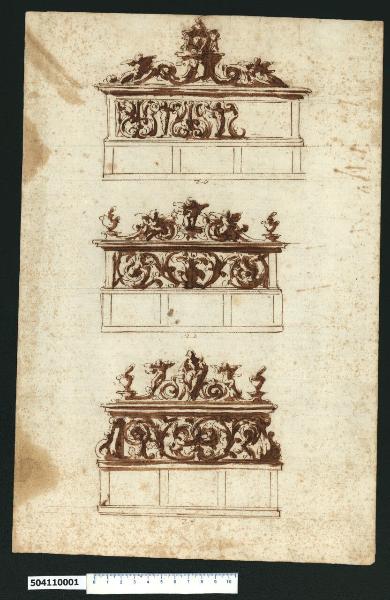 - NOTIZIE STORICO CRITICHE Nell'"Indice de due Tomi d'Intagli Tempietti ed altro", relativo ai tomi V e VI e compilato dal collezionista Giacomo Sardini, il disegno viene iscritto nel paragrafo "Carozze e carette" con la definizione "40 Partite di dietro".\nIl soggetto di questo disegno, disegnato in tre varianti decorative in sequenza dall'alto al basso sul foglio, non è identificabile con certezza. È composto da tre riquadri, di cui è indicata la dimensione, comuni alle tre soluzioni, mentre variano gli elementi decorativi che rivestono il pannello mediano e quelli soprastanti la cornice terminale. Secondo le indicazioni fornite da Giacomo Sardini, potrebbe trattarsi del pannello posteriore di un calesse, la cui parte inferiore che costituirebbe il cassone. Tuttavia più verosimilmente i pannelli sembrano far parte di un arredo ecclesiastico (forse stalli o alzate per armadi), essendo presente una decorazione a carattere religioso, tra cui il tema della Madonna col Bambino.\nMotivi di girali vegetali intrecciati, alternati a putti, sono ricorrenti nelle decorazioni di Giovanni Battista Montano, cui sembra possibile attribuire questo disegno, già segnalato da V. Pracchi su indicazione di A. Bedon (Pracchi, 1991 p. 14) e da L. Fairbairn (Fairbairn, 1998 vol. II, Appendix 8, p. 771).\nNel primo disegno il pannello mediano presenta un decoro definito solo in parte, perché ripetitivo, di motivi vegetali in volute contrapposte e calice centrale, alternati da putti alati che li sostengono. Sopra la cornice rettilinea, due volute vegetali su cui sono distesi due putti alati, si incontrano al centro ai lati di una cartella forse per stemma gentilizio, formando un piedistallo su cui è assisa come su un trono e in atteggiamento regale, una figura femminile, la Madonna, la cui veste è sostenuta da putti alati.\nNel secondo disegno il decoro del pannello mediano forma dei girali che si incontrano in un calice fiorito centrale, mentre sopra la cornice rettilinea si trovano alle estremità due urne fumanti dalla cui base si sviluppano volute vegetali contrapposte dai cui occhi fuoriescono due putti alati. Un terzo putto si trova sul piedistallo tra le due volute.\nIl motivo dei girali è ripreso con disegno diverso nella terza versione. Qui si intrecciano al centro e si sviluppano ai lati con un grosso fiore. La composizione è racchiusa lateralmente da due volute, a differenza delle fasce del pannello dei due casi precedenti. Sopra la cornice rettilinea si ripete il motivo delle urne fumanti e delle volute contrapposte, su cui i putti alati sono qui seduti, mentre al centro è seduta su piedistallo, in atteggiamento molto naturale, la Madonna col Bambino.