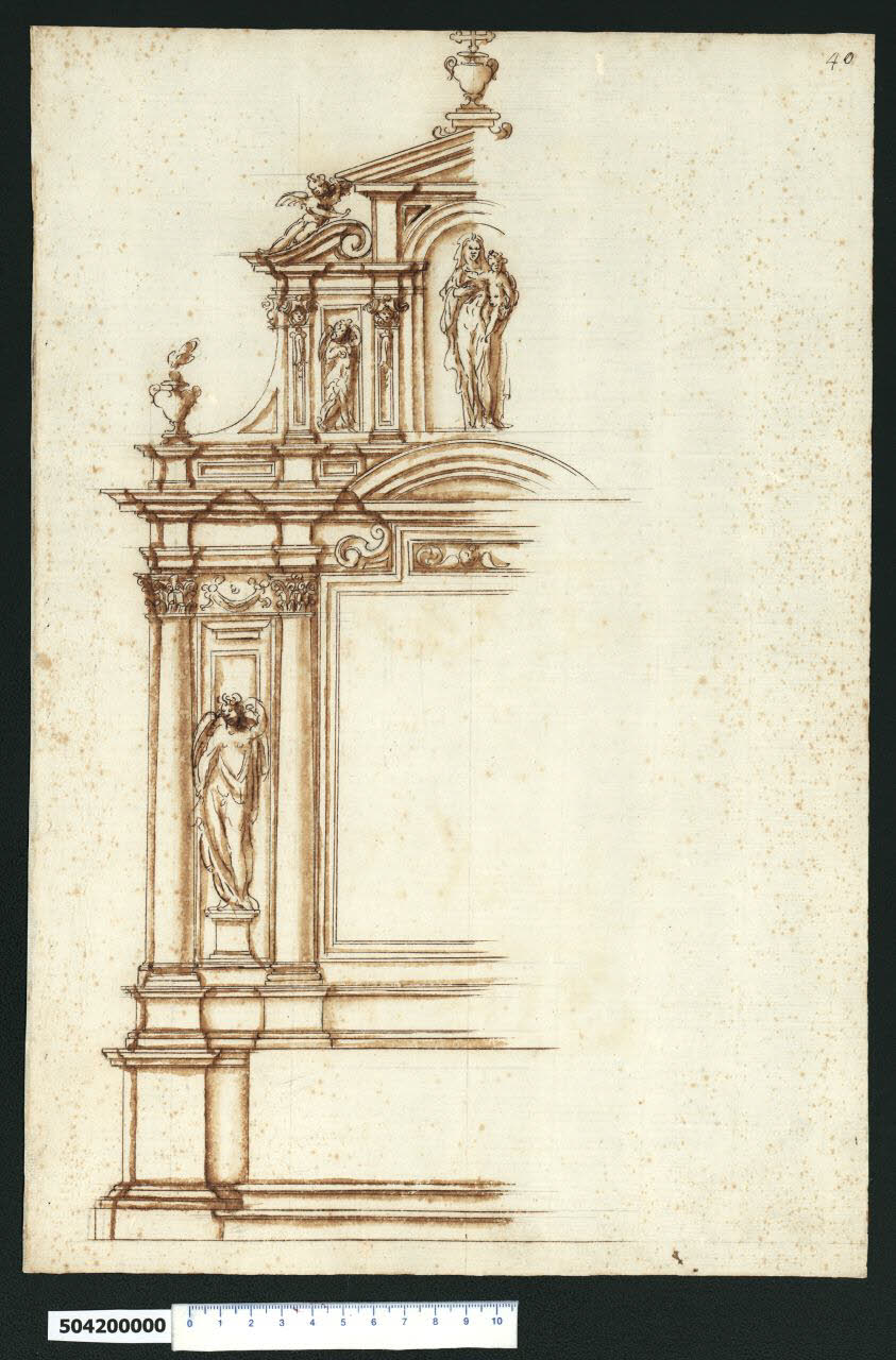 - NOTIZIE STORICO CRITICHE Nell'"Indice de due Tomi d'Intagli Tempietti ed altro", relativo ai tomi V e VI e compilato dal collezionista Giacomo Sardini, il disegno viene iscritto nel paragrafo "altari diversi" con la definizione "40. a quattro colonne". Il foglio è attribuito a Giovanni Battista Montano da Valeria Pracchi (1991, 2a parte) su segnalazione di Anna Bedon. Il disegno mostra la metà sinistra del prospetto di un altare con struttura molto semplice nella parte basamentale. Ai lati della pala d'altare dal profilo superiore sagomato e soprastante timpano curvilineo, si impostano due colonne corinzie nel cui breve intercolumnio è collocata una statua raffigurante un angelo. Al di sopra della trabeazione la composizione è limitata alla parte centrale, e si articola in due campate: quella laterale, più bassa, è delimitata da due lesene che inquadrano una statua, ed è collegata con una voluta alla campata centrale più alta. Quest'ultima presenta una nicchia con la statua della Vergine con Bambino, sormontata da un timpano triangolare. La composizione rimanda ai numerosi esempi rintracciabili nella produzione di Montano, in parte pubblicati nel 1625 da G.B. Soria nell'opera "Diversi ornamenti capricciosi per depositi o altari". Va comunque fatto presente che, sebbene sia evidente la relazione tra le soluzioni pubblicate e gli altari raffigurati nei fogli conservati oltre che a Milano (Collezione Sardini Martinelli inv. 5,46; 5,47; 6,24; 6,31; 6,39; 6,84; 6,87; 6,145; 6,147) anche a Madrid (Biblioteca Nacional, inv. AB 882, 894), questi sono assegnabili ad una fase precedente. Nei disegni sono riscontrabili certi arcaismi che non si ritrovano più nelle incisioni pubblicate (Rodriguez Ruiz 1991, pp. 97-98).