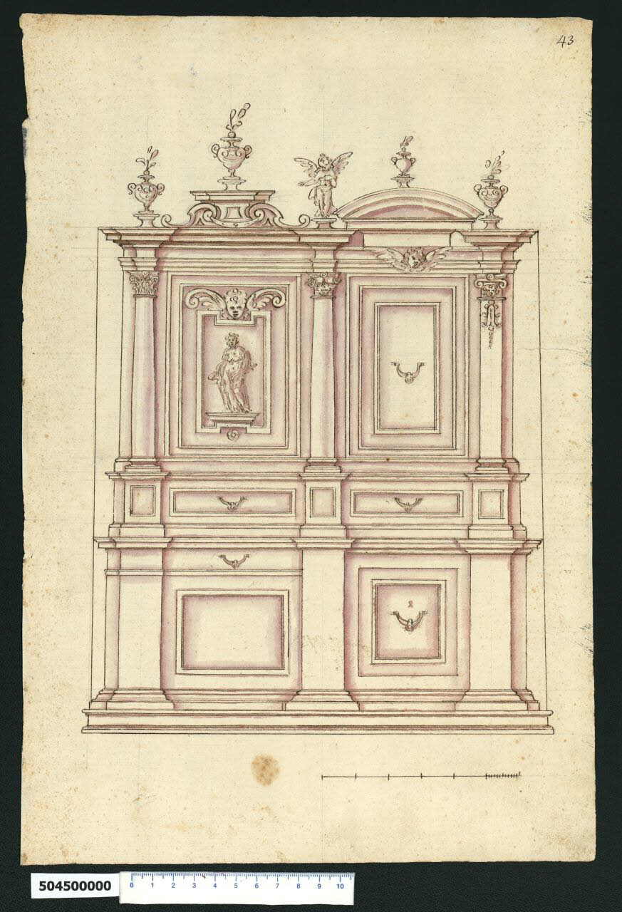 - NOTIZIE STORICO CRITICHE Nell'"Indice de due Tomi d'Intagli Tempietti ed altro", relativo ai tomi V e VI e compilato dal collezionista Giacomo Sardini, il disegno viene iscritto sia nel paragrafo "Banchi" con la definizione "43 In due maniere", sia nel paragrafo "Gabinetti" con la definizione "43 a banco di sagrestia". L'attribuzione del disegno a Giovanni Battista Montano fatta da Valeria Pracchi (1991, 2a parte) su segnalazione di Anna Bedon, è confermata dalla Fairbairn (1998, p. 771). Mentre la Pracchi mantiene l'identificazione del soggetto data da Sardini, la Fairbairn lo individua come credenza. Alla medesima tipologia la Fairbairn associa altri disegni della collazione milanese (Milano, Collezione Sardini Martinelli, inv. 5,2; 6,51; 6,89; 6,97; 6,112; 6,121; cui aggiunge Roma, BAV, Ottoboniana lat. 3110 fol. 25). Tutti questi fogli mostrano soluzioni dimensionali molto simili, con una larghezza limitata a due ante e un'altezza che varia da uno a due ordini. Forse risulta più appropriato utilizzare il termine armadio laddove, come nel nostro caso, sia destinato ad una sacrestia. Il disegno raffigura due alternative impostate su due campate, e articolate in tre registri. Nella metà sinistra il registro inferiore presenta una specchiatura (probabilmente un'anta per la quale non è stata disegnata la maniglia) con soprastante cassetto; sopra questa sorta di basamento si trovano i piedistalli delle colonne e un cassetto. Nello spazio racchiuso tra le due colonne (con capitello ornato da una testa di cherubino a destra, e corinzio a sinistra) è inserita un'anta con edicola centrale ornata da una figura femminile. Sopra la trabeazione è collocato un fastigio a volute contrapposte. Nel settore a destra la sequenza prevede, dal basso verso l'alto, uno sportello dotato di maniglia centrale, un cassetto posto tra i piedistalli e un'anta con semplici cornici nell'intercolumnio, coronato in sommità da un timpano curvilineo. In luogo della colonna, all'estremità destra è prevista una lesena pseudo ionica.