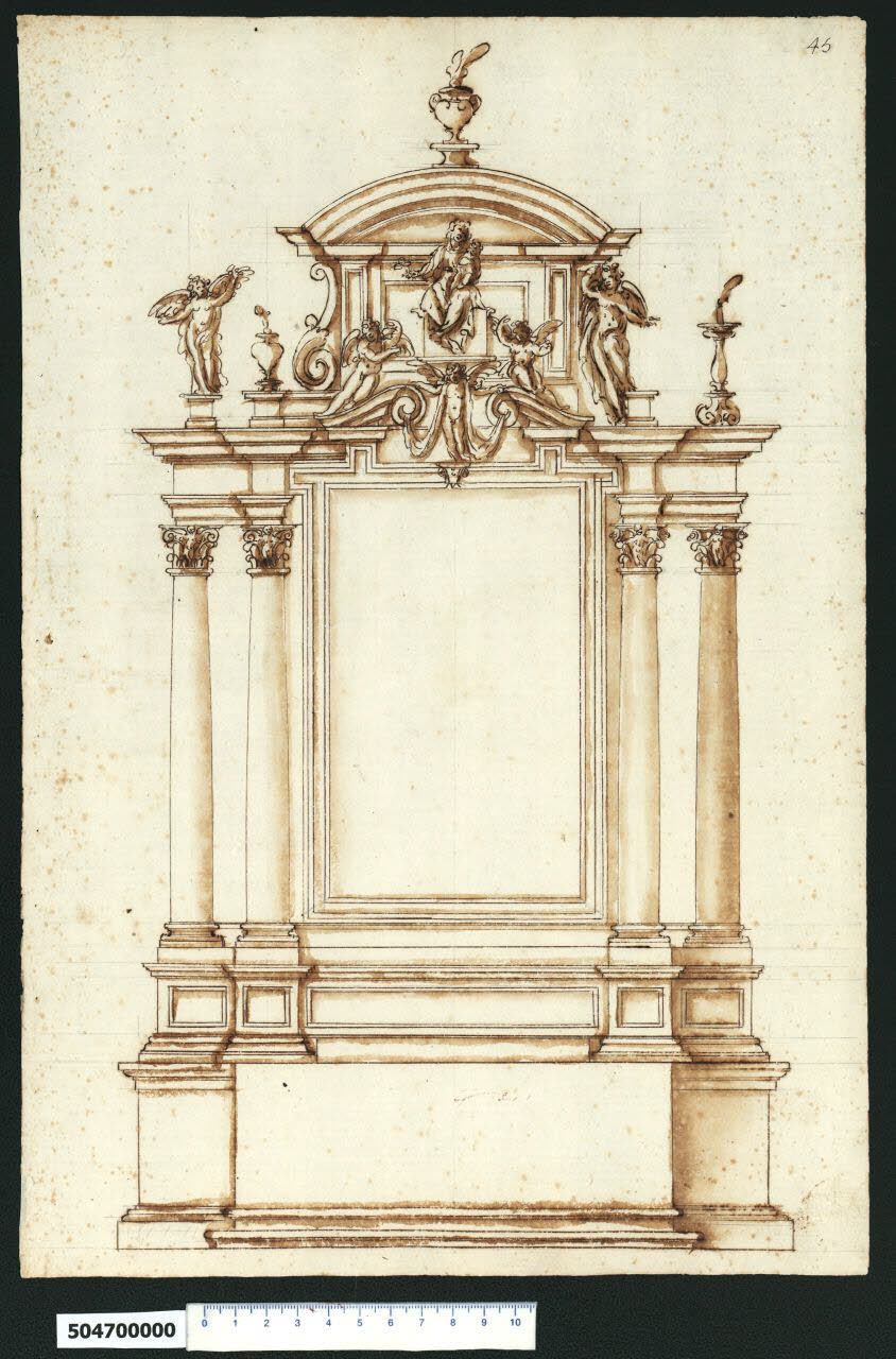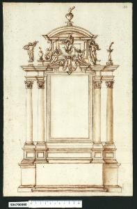 - NOTIZIE STORICO CRITICHE Nell'"Indice de due Tomi d'Intagli Tempietti ed altro", relativo ai tomi V e VI e compilato dal collezionista Giacomo Sardini, il disegno viene iscritto nel paragrafo "altari diversi" con la definizione "... e 45" [si legga: come sopra a quattro colonne].\nIl disegno raffigura il progetto di un altare, sulla cui struttura alcuni elementi decorativi della parte alta sono presentati in due varianti sui due lati. Il disegno è opera di Giovanni Battista Montano, di cui si ravvisano le caratteristiche stilistiche e la cui attribuzione è stata indicata da V. Pracchi su segnalazione di A. Bedon (Pracchi, 1991 p. 14) e da L. Fairbairn (Fairbairn, 1998 vol. II, Appendix 8, p. 770).\nLa composizione è resa plastica dalla disposizione su piani verticali differenti degli elementi architettonici che la ordinano, costituiti da un'alta zoccolatura in cui è inserito l'altare, avanzato e rialzato su due gradini, da un basamento soprastante articolato e decorato con riquadrature e da due coppie di colonne corinzie, di cui quelle appoggiate sull'altare avanzate rispetto alle laterali esterne e individuanti una campitura centrale con cornice sagomata, atta a ospitare una raffigurazione religiosa. \nLo sfalsamento dei piani, sottolineato nel disegno dalle ombreggiature, è reso evidente anche dalla plasticità della trabeazione che corre a L ai due lati sopra i capitelli delle colonne. Sopra la cornice sagomata della campitura centrale è impostato un frontone spezzato a volute con un angelo al centro. Questi si appoggia con le mani alle volute, i cui occhi sostengono i drappi che scendono dalle sue spalle. Altri due angeli seduti su tale frontone, indirizzano l'attenzione sulla figura centrale della composizione superiore: la Madonna col Bambino seduta su un basamento e con un giglio nella mano, inquadrata da un ampio frontone curvilineo su base rettangolare riquadrata e con urna fumante superiore, sostenuto a sinistra da una doppia voluta contrapposta e a destra dalla statua di un angelo sceso per tale funzione dal suo piedistallo. \nLe altre due varianti decorative sono l'angelo e l'urna fumante poste sulla trabeazione in corrispondenza rispettivamente della colonna esterna e interna di sinistra e il candeliere fumante in corrispondenza della colonna esterna di destra.\nLa disposizione degli elementi architettonici principali è simile in quella di altri due disegni presenti nella Collezione, pur con varianti o semplificazioni decorative (Milano, Collezione Sardini Martinelli invv. 5,46 e 6,39).