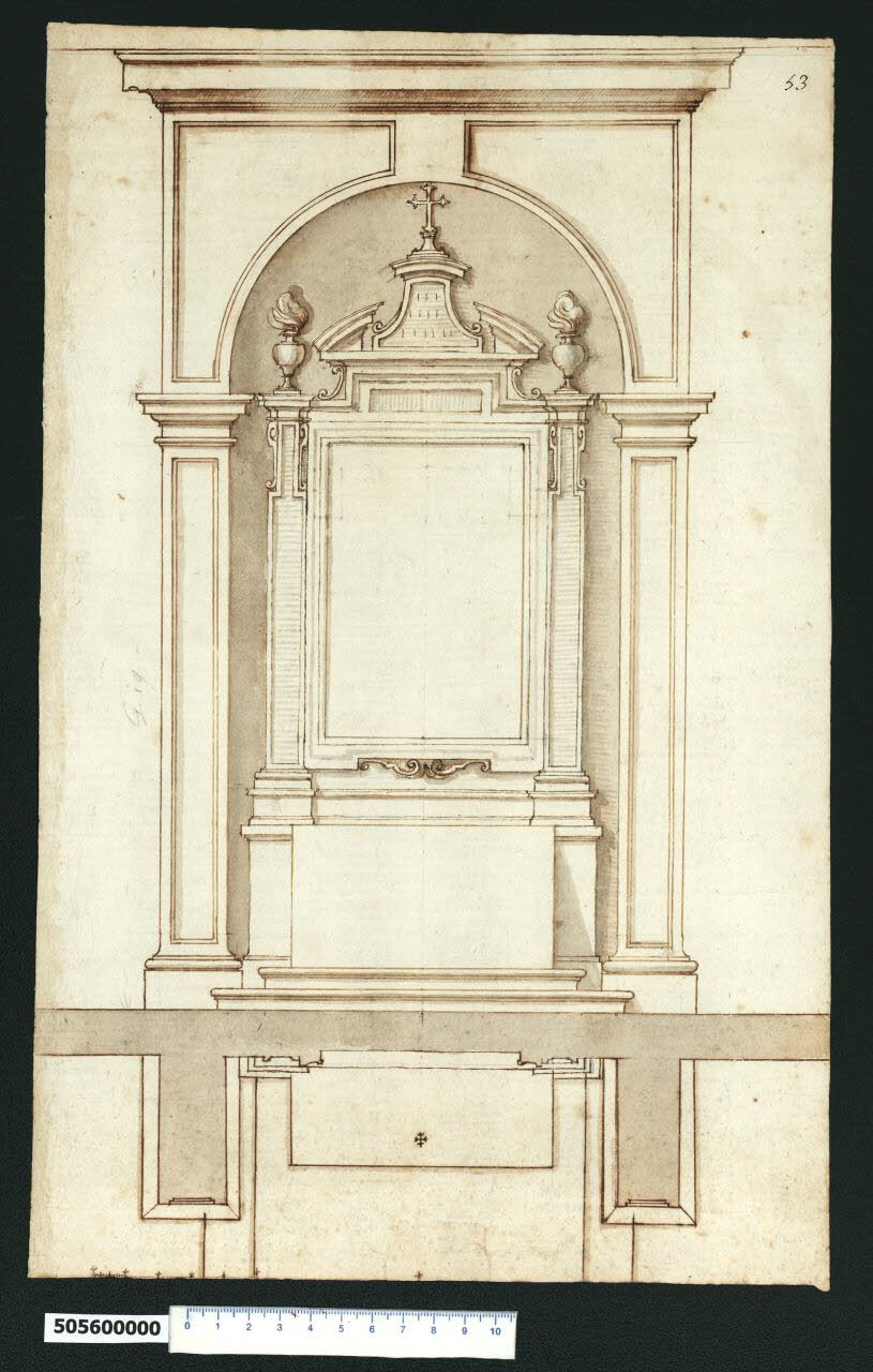 - NOTIZIE STORICO CRITICHE Nell'"Indice de due Tomi d'Intagli Tempietti ed altro", relativo ai tomi V e VI e compilato dal collezionista Giacomo Sardini, il disegno viene iscritto nel paragrafo "altari diversi" con la definizione "53 Altare senza colonne".\nIl disegno raffigura un altare rappresentato in pianta e prospetto. La sezione orizzontale consente di comprendere la profondità del manufatto, altrimenti poco intuibile nonostante la coloritura degli sfondati e delle ombreggiature con inchiostro acquerellato. L'altare è inquadrato da due pilastri molto avanzati rispetto alla parete, riquadrati, con base sagomata e cornici superiori sporgenti, su cui è impostata un'arcata voltata a botte inscritta in un parallelepipedo, sormontato da una cornice aggettante. Gli spicchi di risulta tra l'arco e la cornice superiore sono riquadrati come i pilastri. Il parallelepipedo sporgente della mensa, rialzato su una pedana di due gradini molto avanzata, è alla base di una sorta di edicola con campitura centrale incorniciata e sagomata, adatta a contenere una raffigurazione religiosa. Ai lati della cornice due piedritti conformati sostengono due urne fumanti tramite la base sorretta da esili volute allungate. Al centro delle stesse e sopra una riquadratura per iscrizione, è posto a conclusione un frontone curvilineo spezzato con al centro un elemento trapezoidale curvilineo, recante uno spezzone di cornice ricurvo a sostegno di una croce trilobata.