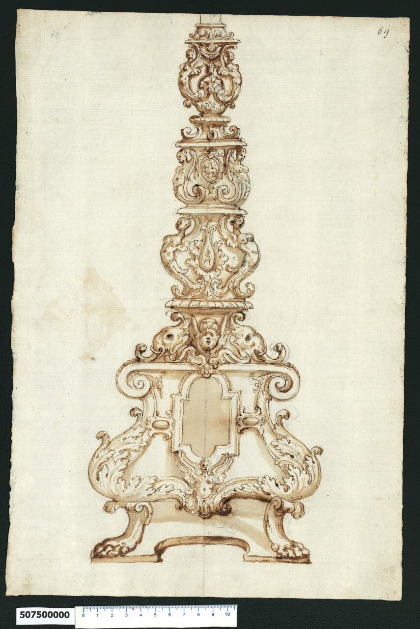 - NOTIZIE STORICO CRITICHE Nell'"Indice de due Tomi d'Intagli Tempietti ed altro", relativo ai tomi V e VI e compilato dal collezionista Giacomo Sardini, il disegno viene iscritto nel paragrafo "Candelieri" con la definizione "69 Candelabro".\nIl candeliere qui raffigurato presenta una decorazione molto elaborata, che si sviluppa su vari livelli a partire da un piedistallo liscio sagomato. Questo presenta angoli decorati da zampe di leone che, dissolvendosi superiormente in un cartiglio, sostengono la larga base arrotondata e circondata da foglie d'acanto, che si restringe superiormente fino ad arrestarsi contro un piano arrotolato agli estremi in volute. Le foglie d'acanto si dipartono da una figura centrale di sirena posta nella parte bassa a sostenere con le ali una riquadratura sagomata che probabilmente doveva contenere un'effigie e che è allacciata lateralmente alle foglie d'acanto da due gemme circondate da cartiglio. \nSopra il piano superiore, il tratto concavo del candeliere è decorato da due teste di elefante contrapposte e inframmezzate da una testina di cherubino appoggiata sulle ali, che sembrano sostenere il livello successivo con l'intermediazione di un piano presumibilmente circolare dal bordo inciso a petali. Il terzo livello del candeliere, di forma bombata, è decorato da figure sinuose di sirene distese con ali rivolte verso l'alto, alternate a un motivo vegetale di foglie d'acanto che formano un grosso calice. Il quarto livello, sempre diviso da un piano circolare dal precedente, riprende il motivo delle sirene, ma accovacciate con le code arricciate in volute verso l'interno e le ali richiuse vero il basso, a sostenere uno stemma prelatizio con al centro un elefante che sostiene una portantina.\nDopo un elemento di raccordo con riccioli di volute, è l'ultimo segmento bombato che sostiene il portacandela, ancora decorato da sirene distese con ali rivolte verso l'alto, su riccioli di foglie d'acanto, che reggono con le code un fiore a forma di ventaglio sormontato da un calice e da una ghirlanda.\nIl disegno si interrompe all'altezza del portacandela decorato con foglie d'acanto, per il raggiunto limite del foglio. \nIl candeliere è sicuramente ricco di riferimenti simbolici, sia in riferimento alla casata per cui è realizzato, sia alle virtù dei suoi componenti. La sirena bicaudata è uno degli emblemi della famiglia Colonna, mentre l' elefante è una delle figure più antiche della simbologia propiziatoria, segno di forza, benignità, temperanza e mansuetudine. Nelle feste nunziali indicava castità, fedeltà coniugale e fecondità legittima. \nAltri disegni della presente collezione riproducono motivi di sirene bicaudate (Milano, Collezione Sardini Martinelli invv. 6,95; 6,135), presenti anche come decorazione in un cielo di carrozza per la famiglia Colonna (Ibidem, inv. 8,105). Il presente candeliere potrebbe quindi essere un elemento di arredo studiato in occasione del matrimonio di un membro di questa famiglia.\nIl disegno è attribuito in forma dubitativa a Giovanni Battista Montano da V. Pracchi, su segnalazione di A. Bedon (Pracchi, 1991 p. 15).