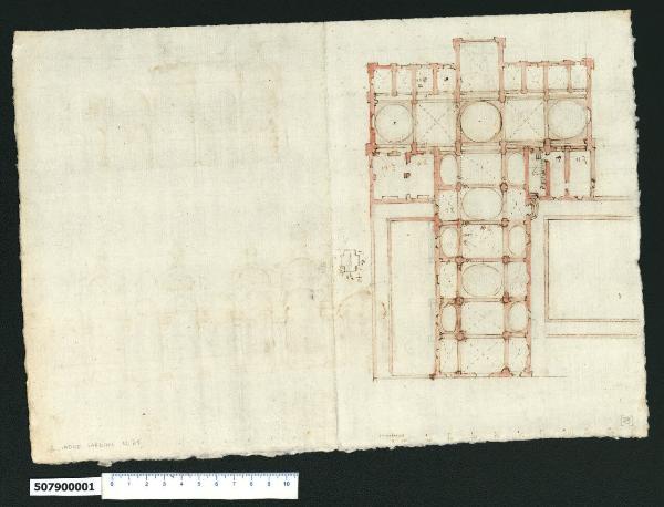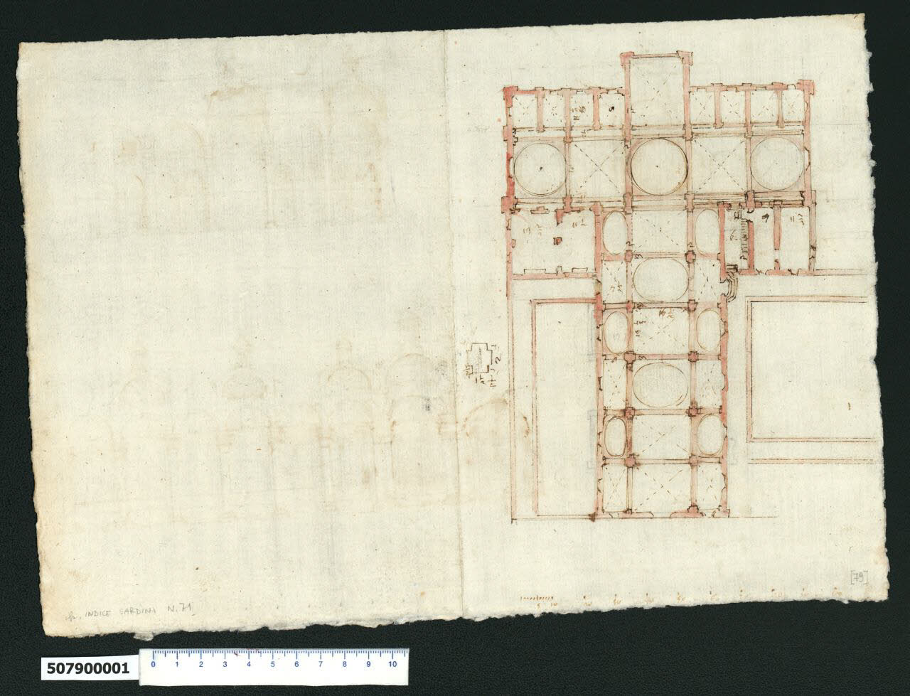 - NOTIZIE STORICO CRITICHE Nell'"Indice de due Tomi d'Intagli Tempietti ed altro", relativo ai tomi V e VI e compilato dal collezionista Giacomo Sardini, il disegno viene iscritto sia nel paragrafo "Chiese e loro parti" con la definizione "71 pianta", sia, insieme al disegno sul verso, nel paragrafo "Tempietti" con la definizione "71 elevazione e pianta".\nIl foglio, originariamente piegato, riporta sulla parte destra la pianta di una chiesa a croce latina affiancata da chiostri. Il disegno è stato identificato da Mauro Mussolin come progetto per la ricostruzione della chiesa di S. Francesco a Siena, di cui un incendio aveva distrutto il 25 agosto 1655 la zona attigua alla sagrestia (Mussolin, 2010 pp. 67-68) ma non si sono trovati ulteriori riscontri che possano confermare l'ipotesi.\nIl progetto, di cui non è individuato l'autore, costituirebbe secondo Mussolin una rielaborazione dei progetti peruzziani per la chiesa di S. Domenico a Siena, verso i quali in un primo tempo si era orientata Valeria Pracchi per l'attribuzione in forma dubitativa del disegno (Pracchi, 1991, p. 15). Riguardo a questa chiesa è possibile riscontrare un'affinità nella forma e disposizione delle cappelle e del coro sul fondo del transetto.\nIl disegno è da porre in relazione con il seguente (Milano, Collezione Sardini Martinelli inv. 5,79 V) tracciato sul verso del foglio, che illustra alcune proposte di sviluppo verticale della chiesa con due sezioni trasversali e una longitudinale.\nL'impianto presenta un corpo longitudinale costituito da una navata centrale suddivisa in sei campate rettangolari cui sono affiancate due navatelle laterali larghe metà della centrale. Questo incontra un transetto di cinque campate quadrate con lato pari alla larghezza della navata centrale, su cui si aprono, sul fondo della chiesa, coppie di cappelle ai lati e un coro rettangolare allungato in corrispondenza della navata centrale.\nA lato del corpo longitudinale si trovano due chiostri rettangolari di diversa dimensione coi relativi accessi dalla chiesa (di cui quello di destra ribassato di quattro gradini), mentre negli angoli all'incrocio dello stesso con il transetto, sono disposti dei locali di servizio alla chiesa.\nLa struttura è costituita da pilastri a croce, di cui uno, quotato, è rappresentato in dettaglio sul lato sinistro della pianta nei pressi del chiostro, su cui sono impostate arcate in senso traversale e longitudinale. Gli appoggi sono raddoppiati in corrispondenza del transetto.\nLa facciata presenta tre ingressi in corrispondenza delle navate e aperture laterali lungo tutto il perimetro. \nLa navata principale è coperta inizialmente con due volte a crociera e poi alternativamente con cupole ovali e volte a crociera. Anche il transetto presenta cupole alternate a volte a crociera, ma in questo caso le cupole sono emisferiche e le crociere a spicchi uguali. Le cappelle e il coro presentano coperture a crociera rettangolari. Le navate laterali hanno invece volte a crociera alternate da ovali in questo caso longitudinali, in sequenza sfalsata rispetto alla navata centrale. Gli ovali però non rappresentano delle cupolette estradossate, come si evince dalle sezioni riprodotte sul verso del foglio, ma potrebbero indicare delle cornici o dei pennacchi sezionati di raccordo per delle volte a pianta ovale ribassate. Sempre confrontando la pianta con le sezioni, si rileva che le navatelle sono scandite da una sequenza di archi trasversali impostati a due terzi dell'altezza dei pilastri, mentre i muri acquerellati tra le campate in senso longitudinale dovrebbero riferirsi agli archi superiori posti alla stessa altezza di quelli trasversali della navata centrale. \nIl disegno, parzialmente quotato, è tracciato con grafia veloce e sommaria, pur presentando i muri campiti ad acquerello.