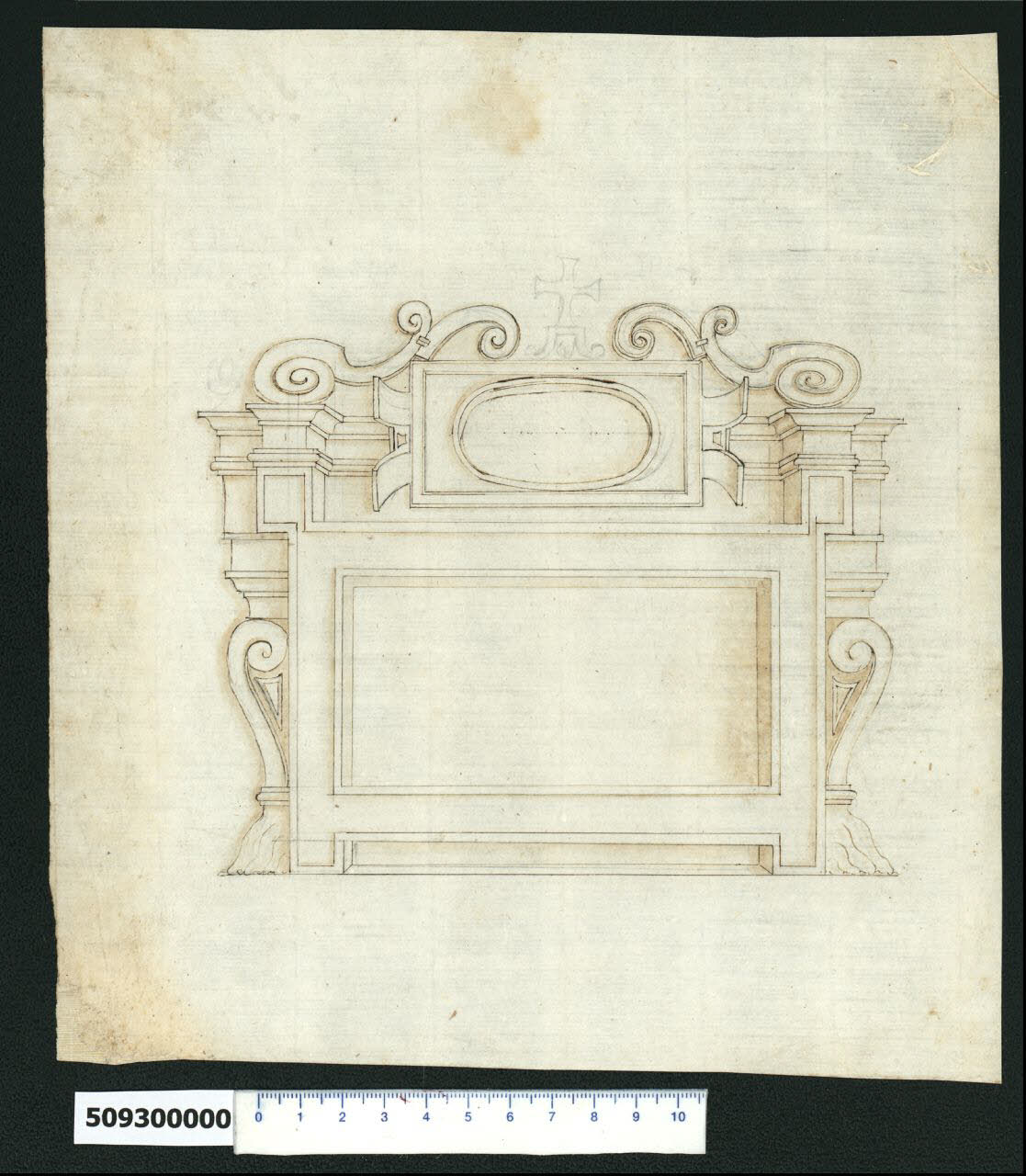 - NOTIZIE STORICO CRITICHE Nell'"Indice de due Tomi d'Intagli Tempietti ed altro", relativo ai tomi V e VI e compilato dal collezionista Giacomo Sardini, il disegno viene iscritto, insieme ad altro foglio contiguo, nel paragrafo "Imagini ornate Iscrizioni" con la definizione "81. 82. a guisa di Finestra".\nIl disegno è da porre in relazione a quello di cui all'inv. 5,123 (Milano, Collezione Sardini Martinelli), poiché potrebbe costituire una variante di uno degli elementi della composizione e in ogni caso sembra riferirsi allo stesso autore.\nSul foglio è raffigurata una doppia cornice per ornato e iscrizione decorata, composta da una grande campitura rettangolare con riquadratura sagomata, affiancata da due mensole a voluta allungate e appoggiate alla base con una sorta di frange allargate. Le volute sorreggono l'impalcato decorativo superiore costituito da un insieme di cornici sagomate, da cui emergono frontalmente gli angoli distaccati della riquadratura sottostante. Al centro di tale impalcato e sopra la riquadratura per ornamento, è appesa la lastra per l'iscrizione. Quest'ultima ha forma rettangolare con campitura centrale ovale incassata e bordatura da cui escono lateralmente due cartigli ricurvi divergenti. L'impalcato decorativo si conclude con un ornamento a volute schiacciate che, partendo dalla cornice sopra gli angoli della riquadratura, si uniscono ad altre due che si fronteggiano appoggiandosi sopra la lastra per iscrizione. Al centro, sopra la lastra e tra le volute, è una croce dei cavalieri templari su piedistallo. Non vi sono elementi che consentano di identificare l'autore del disegno. La sola croce potrebbe indicare che la cornice fosse dedicata a un appartenente a un Ordine avente come emblema questo elemento. Si ritiene comunque che il disegno sia stato eseguito in ambito romano verso la fine del XVI secolo.