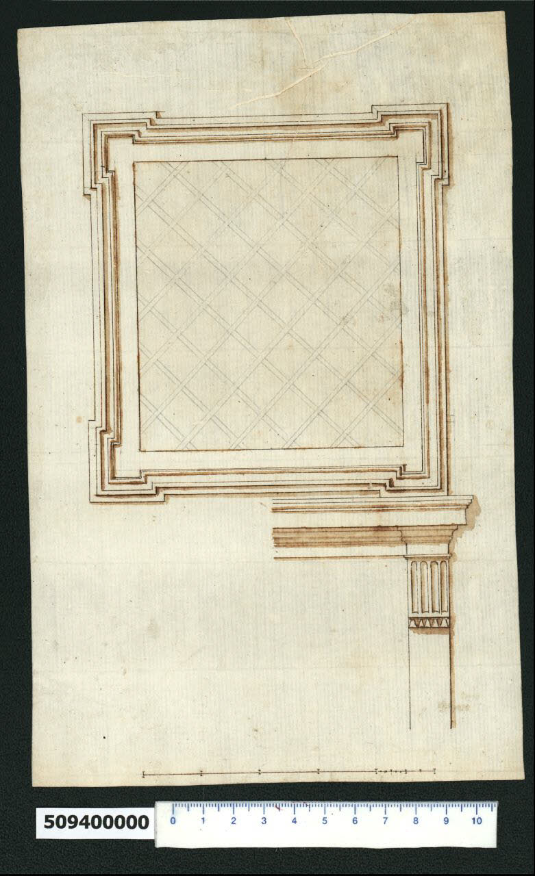 disegno in scala, conserva tracce della preliminare costruzione a grafite; è eseguito a inchiostro bruno a penna principalmente con tiralinee e le parti rilevate sono evidenziate con inchiostro bruno acquerellato; il supporto sul quale è tracciato è carta avorio dal formato irregolare