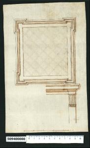 - NOTIZIE STORICO CRITICHE Nell'"Indice de due Tomi d'Intagli Tempietti ed altro", relativo ai tomi V e VI e compilato dal collezionista Giacomo Sardini, il disegno viene iscritto, insieme ad altro foglio contiguo, nel paragrafo "Imagini ornate Iscrizioni" con la definizione "81. 82. a guisa di Finestra". Il disegno rappresenta una finestra quadrata con un contorno dagli angoli sagomati sporgenti, di cui sono presentate due versioni rispetto alla mezzeria: quella di sinistra, libera nella muratura, ha l'angolo inferiore sagomato come il superiore; l'altra, a destra, presenta un angolo inferiore sporgente solo verso il basso, appoggiato a un davanzale sorretto da un triglifo posto al termine di una lesena liscia. La finestra è protetta da una grata in metallo a maglia quadrata posata in diagonale. Non vi sono elementi che consentano di identificare l'autore del disegno, molto accurato nella sua definizione, che potrebbe essere posto in relazione con altri presenti nel V tomo (Milano, Collezione Sardini Martinelli invv. 5,55; 5,56; 5,117).