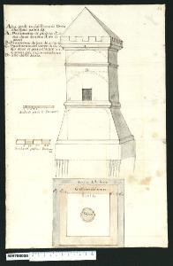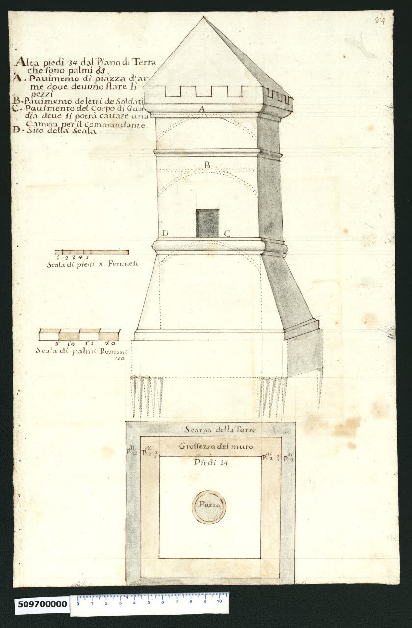 - NOTIZIE STORICO CRITICHE Nell'"Indice de due Tomi d'Intagli Tempietti ed altro", relativo ai tomi V e VI e compilato dal collezionista Giacomo Sardini, il disegno viene iscritto nel paragrafo "Case loro parti" con la definizione "84 Torre".\nIl foglio in esame riporta la rappresentazione in pianta e in prospettiva di una torre quadrata alta 34 piedi ferraresi, ossia 63 palmi romani. La pianta evidenzia l'inclinazione della scarpata di base, posta su un basamento che dal disegno in alzato risulta infisso nel terreno con ulteriori fondazioni a cuneo poste sugli spigoli e lo spessore del muro della torre acquerellato di colore marrone. Al centro della pianta è un pozzo circolare a pavimento.\nLa torre si eleva con un corpo diviso a due terzi di altezza da una cornice sagomata che riprende in tono minore quella di raccordo con la muratura a scarpa di base, all'altezza della quale è l'unica apertura presente nella torre. Su un'ulteriore cornice a mezzo toro in sommità si imposta la copertura a forma piramidale decorata alla base da una merlatura. Nella legenda a lato sono fornite indicazioni circa l'uso dei diversi piani interni della torre. Si tratta di ambienti coperti a volta collegati da una scala. Al secondo livello è il pavimento del Corpo di Guardia, dove sarà collocata la camera per il Comandante; il piano superiore sarà riservato ai letti dei soldati, mentre alla base della copertura è il pavimento della piazza d'arme con i pezzi di artiglieria.\nNon è possibile individuare l'autore del disegno. Tuttavia si rileva che nel 1663 la Francia di Luigi XIV aveva occupato alcuni territori ferraresi a seguito di incidenti diplomatici con lo Stato Pontificio. Perciò è possibile che, in seguito a questo episodio il Papa decidesse di aumentare i sistemi di fortificazione della città. Diversi progetti conservati all'Archivio di Stato di Modena presentano soluzioni fortificatorie di Ferrara di quegli anni, attribuite a Carlo Pasetti (Cfr. C. Guaraldi, Le fortificazioni di Ferrara nel XVII secolo: i progetti di arretramento del settore settentrionale elaborati da Carlo Pasetti, in "Ferrariae Decus" n. 18, 2001 pp. 87-94).