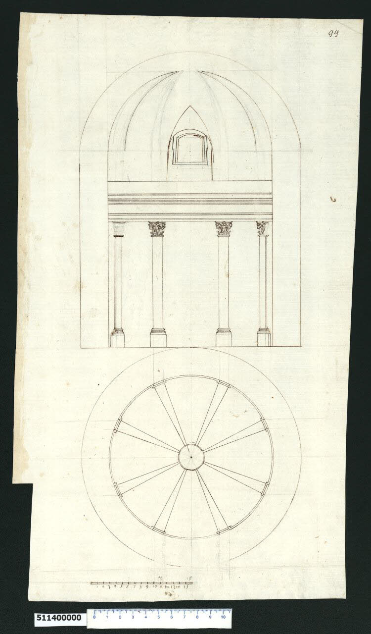 - NOTIZIE STORICO CRITICHE Nell'"Indice de due Tomi d'Intagli Tempietti ed altro", relativo ai tomi V e VI e compilato dal collezionista Giacomo Sardini, il disegno viene iscritto nel paragrafo "Tempietti" con la definizione "99 a cupola". Il disegno, che non è stato possibile identificare, raffigura la pianta, con proiezione della copertura, e la sezione di un piccolo edificio religioso a pianta circolare. L'articolazione parietale è costituita da una sequenza di lesene corinzie poste su un alto piedistallo che reggono una trabeazione liscia. La copertura è realizzata con una volta a ombrello su basso tamburo nel quale, sul lato opposto all'ingresso è ricavata una finestra.