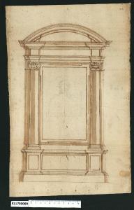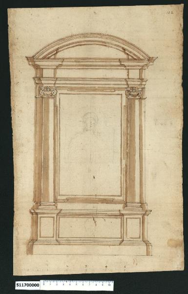 - NOTIZIE STORICO CRITICHE Nell'"Indice de due Tomi d'Intagli Tempietti ed altro", relativo ai tomi V e VI e compilato dal collezionista Giacomo Sardini, il disegno viene iscritto nel paragrafo "altari diversi" con la definizione "102 d'ordine jonico".\nIl disegno, indicato da Giacomo Sardini come altare, sembra essere piuttosto un'edicola votiva, composta per ornare l'effige della Madonna, qui parzialmente accennata a grafite all'interno di una cornice sagomata.\nLa struttura di base è costituita da una zoccolatura sagomata con riquadrature, impostata su un basamento liscio. I sostegni delle semicolonne ioniche che sono ai lati della cornice centrale sono leggermente avanzati, pertanto la composizione risulta movimentata anche dagli effetti chiaroscurali che si creano. Sopra i capitelli ionici, le cui volute sono collegate da festoni, è impostata la trabeazione con cornici sagomate aggettanti, che sostiene un frontone curvilineo in parte spezzato in corrispondenza degli angoli. \nLa fascia alla base della cornice centrale e il riquadro sottostante presentano degli accenni di decorazione.\nNon vi sono altri elementi per attribuire l'opera, che si suppone appartenere per analogia stilistica all'ambito centro-italiano tra XVI e XVII secolo.