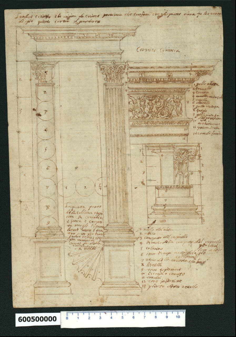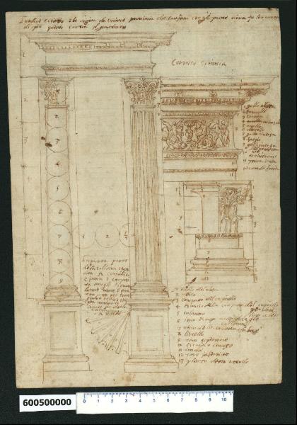 - NOTIZIE STORICO CRITICHE Nell'"Indice de due Tomi d'Intagli Tempietti ed altro", relativo ai tomi V e VI e compilato dal collezionista Giacomo Sardini, il disegno viene iscritto nel paragrafo "Ordini d'architettura" con la numerazione "113".\nL'attribuzione del disegno a Giovanni Battista Montano è fatta da Valeria Pracchi (1991, 2a parte, p. 17) su segnalazione di Anna Bedon, è confermata dalla Fairbairn (1998, p. 770).\nIl disegno mostra due soluzioni dell'ordine corinzio con piedistalli: a sinistra la colonna è liscia e regge una trabeazione con architrave a due fasce, fregio, sottocornice a dentelli, e cornice a gola rovescia; a destra la colonna è scanalata ed è sormontata da architrave a due fasce, fregio liscio, cornice con modiglioni.\nLe colonne (ad esclusione del piedistallo) sono divise in sei parti, la prima corrispondente alla trabeazione, le rimanenti cinque sono a loro volta divise in nove moduli corrispondenti al diametro della colonna. L'intercolumnio misura due moduli e ¾, e al suo interno è disegnato il dettaglio di ¼ della colonna (A) con una didascalia relativa alle scanalature che devono essere 24 per l'ordine ionico, corinzio e composito.\nSulla destra del foglio è delineato il particolare della base, capitello e trabeazione, con legenda esplicativa delle singole parti; quest'ultima corrisponde a quella della colonna scanalata e mostra un fregio con girali e cherubini, e la corona della cornice retta da mensole a voluta.