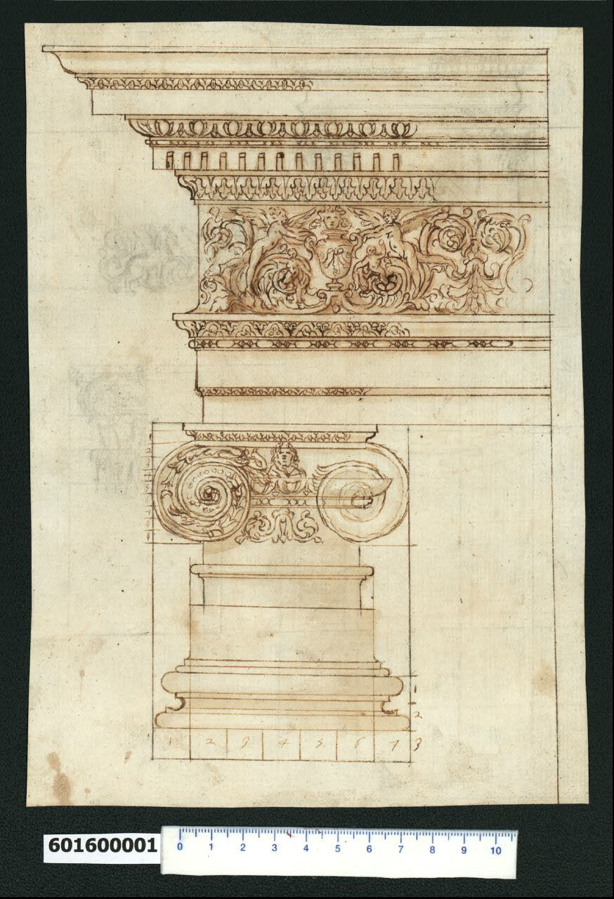 - NOTIZIE STORICO CRITICHE Nell'"Indice de due Tomi d'Intagli Tempietti ed altro", relativo ai tomi V e VI e compilato dal collezionista Giacomo Sardini, il disegno viene iscritto nel paragrafo "Ordini d'architettura" con la numerazione "118".\nL'attribuzione del disegno a Giovanni Battista Montano è fatta da Valeria Pracchi (1991, 2a parte, p. 18) su segnalazione di Anna Bedon, è confermata dalla Fairbairn (1998, p. 771).\nIl disegno raffigura la base, capitello, trabeazione e dettaglio della voluta dell'ordine ionico. La base poggia su un plinto e mostra un astragalo con superiore filetto, scozia, filetto, toro superiore. Per determinare la larghezza della base si divide il diametro inferiore della colonna in cinque moduli; due di questi vengono aggiunti ai lati per definire l'ampiezza della base e del capitello. Il capitello mostra un collarino ornato da foglie e un echino a ovoli e dardi; le volute racchiudono fiori e perline e sono ornate da una testa femminile. La trabeazione ha un architrave a due fasce sormontate da un tondino e una modanatura a gola diritta. Nel fregio due angioletti tra girali reggono un vaso. Una sottocornice con dentelli, tondino e cimasa con ovoli e dardi, regge una cornice che terminazione a gola rovescia. \nUna copia del disegno delineata con un tratto più leggero, si trova in Milano, Collezione Sardini Martinelli inv. 6,7.