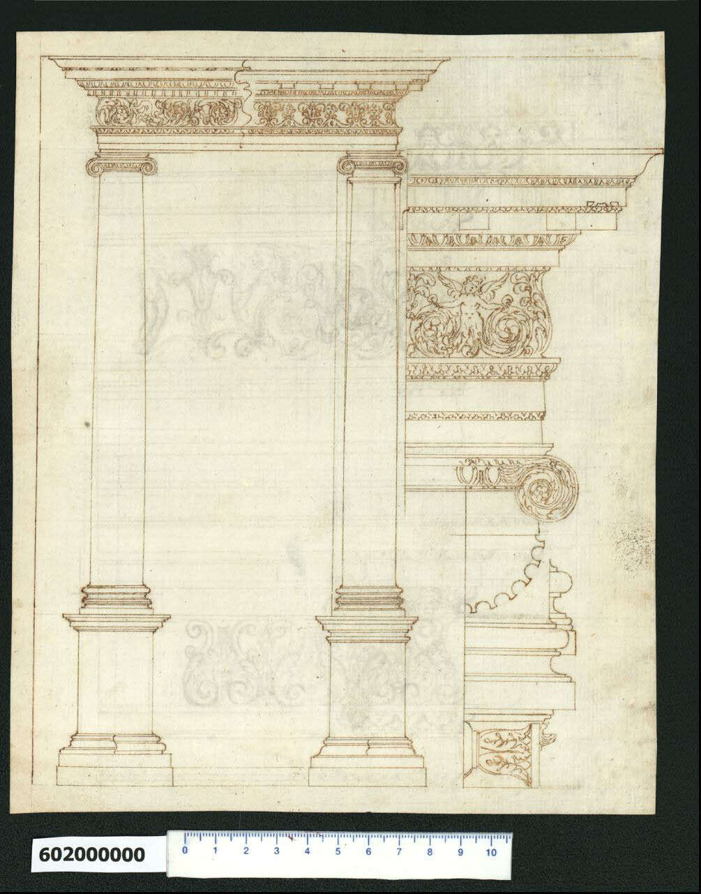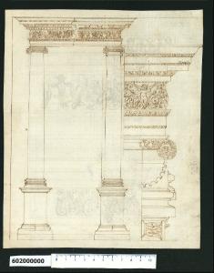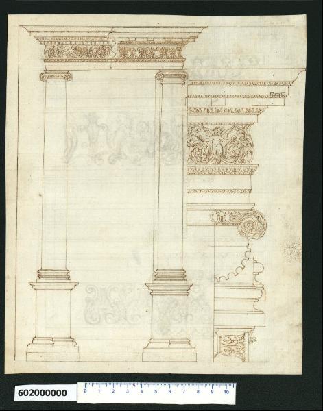 - NOTIZIE STORICO CRITICHE Nell'"Indice de due Tomi d'Intagli Tempietti ed altro", relativo ai tomi V e VI e compilato dal collezionista Giacomo Sardini, il disegno viene iscritto nel paragrafo "Ordini d'architettura" con la numerazione "120"\nL'attribuzione del disegno a Giovanni Battista Montano fatta da Valeria Pracchi (1991, 2a parte, p. 18) su segnalazione di Anna Bedon, è confermata dalla Fairbairn (1998, p. 771).\nIl disegno raffigura due alternative per l'ordine ionico disposte in modo da formare un intercolumnio. Entrambe le colonne si elevano su alto piedistallo che presenta delle differenze nelle modanature. La colonna a sinistra, mostra un classico capitello ionico con echino a ovoli, che sorregge una trabeazione con architrave a due fasce, cimasa a ovolo, fregio pulvinato ornato da girali. La sottocornice ha dentelli e ovoli, mentre la cornice è liscia e termina con una gola rovescia. La colonna a destra mostra la variante del collarino sotto il capitello, del fregio piatto e delle mensole sotto la corona della cornice. A destra è disegnato il dettaglio in alzato di: base, capitello, trabeazione, profilo della voluta e un quarto della pianta del fusto con la disposizione delle scanalature. Per la base sono delineate due alternative, mentre il capitello, con echino a ovoli e dardi, ha volute formate da foglie di vite con rosetta al centro. Sopra l'architrave a due fasce è inserito il fregio pulvinato ornato da una sirena bicaudata con ali. La sottocornice presenta listelli, e cimasa con ovoli e dardi, mentre la corona è retta da mensole e la cornice termina con gola diritta.\nIl fregio pulvinato era utilizzato negli edifici antichi di ordine ionico; Palladio nel suo trattato (Libro Quarto, cap. XV, p. 54, Venezia 1570) illustra il fregio pulvinato del tempio di Serapide nel giardino di palazzo Colonna al Quirinale e quello del battistero di Costantino in Laterano (Fairbairn 1998, p. 584). Montano deve aver guardato anche al Vignola, sebbene esempi di fregio pulvinato erano presenti sia in edifici antichi che moderni (Rodriguez Ruiz 1991, p. 82).\nDisegni con impostazione analoga a quella del foglio oggetto della presente scheda, sono conservati a Milano (Collezione Sardini Martinelli, inv. 6,3), Londra (Sir John Soane's Museum, in Fairbairn 1998, cat. 888-890), Oxford (Ashmolean Museum, The Larger Talman Album, fol. 139 (40)). Nell'opera di De Rossi (1684, I, f. 16) è inserita una tavola molto simile.