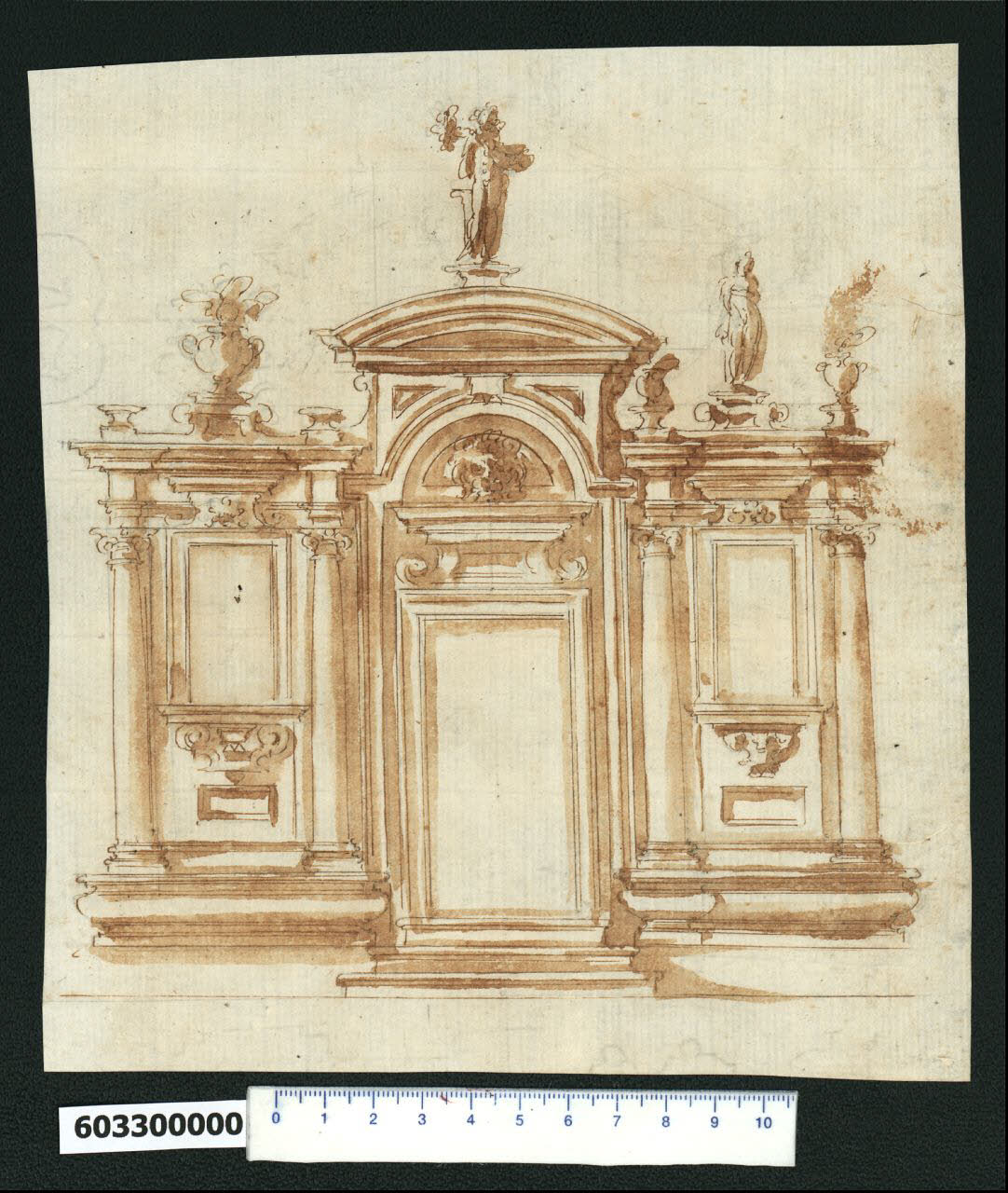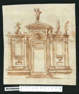 - NOTIZIE STORICO CRITICHE Nell'"Indice de due Tomi d'Intagli Tempietti ed altro", relativo ai tomi V e VI e compilato dal collezionista Giacomo Sardini, il disegno viene iscritto nel paragrafo "Porta" con la definizione "127 con ornati laterali".\nL'attribuzione del disegno a Giovanni Battista Montano fatta da Valeria Pracchi (1991, 2a parte, p. 19) su segnalazione di Anna Bedon, è confermata dalla Fairbairn (1998, p. 771). Mentre la Pracchi conferma l'identificazione proposta da Sardini, la Fairbairn lo individua come coro.\nIl disegno raffigura il progetto decorativo per una parete di un edificio sacro con porta di accesso a un coro e a una sagrestia. La composizione è tripartita, come molti degli altari disegnati da Montano, e prevede le campate laterali poste su un basamento continuo liscio, sopra il quale si sviluppa una fascia fortemente modanata sulla quale poggiano colonne ioniche. Queste inquadrano cornici (forse destinate a ospitare quadri o statue) con davanzale retto da una mensola e sormontato da un fastigio che invade la trabeazione; a conclusione è posto un vaso su piedistallo. Le due campate differiscono lievemente nel disegno della mensola sotto il davanzale, nel basamento delle colonne (che aggetta in corrispondenza di quella più interna) e nella scultura in sommità. La campata centrale ospita la porta architravata cui si accede tramite due gradini. Sopra l'architrave un fastigio con volute regge una testa di leone e un timpano semicircolare completa la struttura.