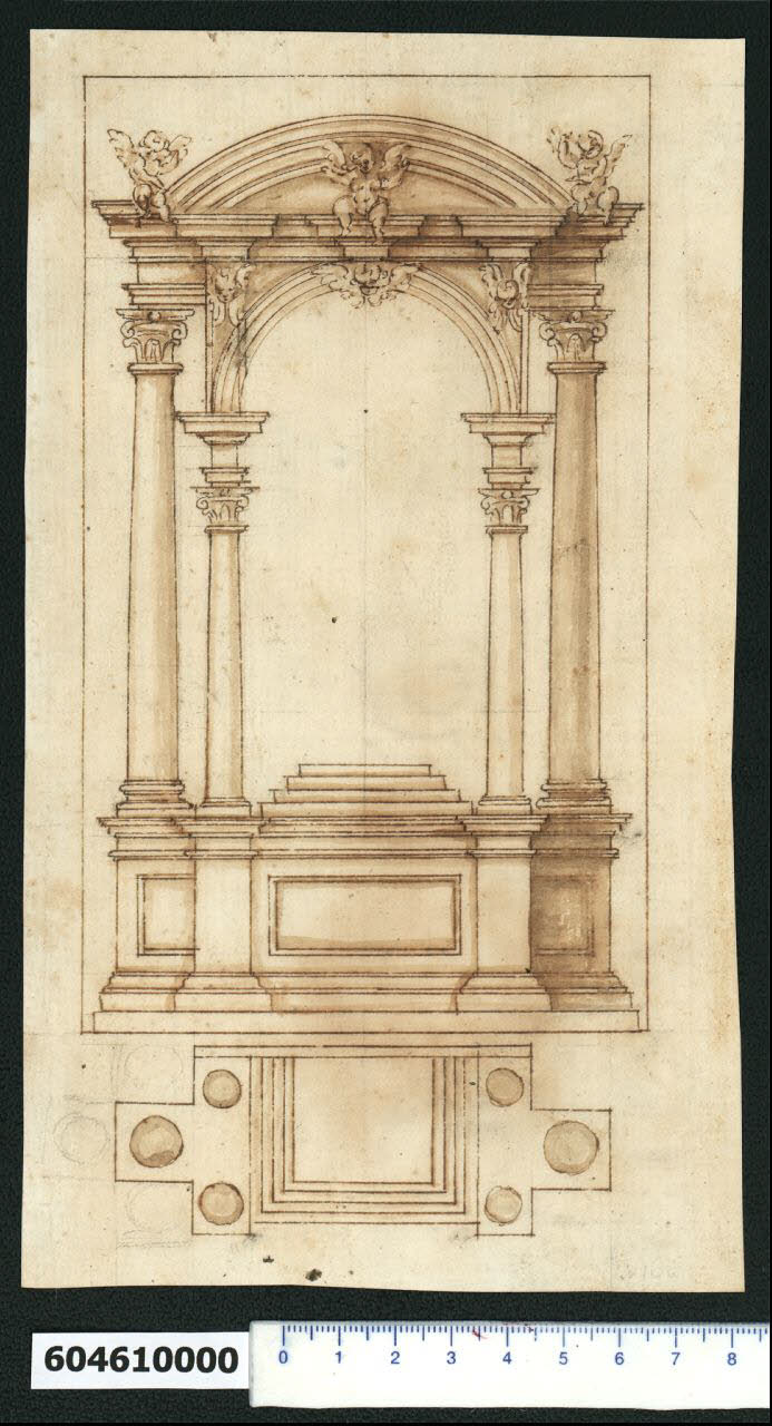 - NOTIZIE STORICO CRITICHE Nell'"Indice de due Tomi d'Intagli Tempietti ed altro", relativo ai tomi V e VI e compilato dal collezionista Giacomo Sardini, il disegno viene iscritto nel paragrafo "altari diversi" con la definizione "134 a due ordini d'architettura".\nIl disegno fa parte di una serie di studi per cibori, che hanno basamento simile, ma variano negli elementi compositivi della parte superiore (Milano, Collezione Sardini Martinelli invv. 6,61a e 6,72a). La raffigurazione è presentata in pianta e in prospetto, quest'ultimo inserito in una marginatura. \nIl basamento è costituito da una parte centrale dal frontale riquadrato, con un rialzo (piedistallo) gradonato soprastante, affiancata da due elementi che in pianta assumono la forma di T, su cui poggiano tre colonne. \nLa composizione, esaminata in alzato, rivela un doppio sistema gerarchizzato: le due colonne esterne, più alte e massicce, che sostengono due tratti di trabeazione con cornici aggettanti su cui siedono putti alati, inquadrano il sistema architettonico centrale costituito da una sorta di baldacchino sorretto da quattro colonne minori sulla cui trabeazione a cornice aggettante è impostato frontalmente un elemento ad arco a tutto sesto con ghiera decorato con teste di cherubino (due agli angoli e una al centro come chiave dell'arco), sopra il quale è impostato un frontone curvilineo spezzato alla base, al cui centro è seduto un putto alato. \nIl disegno in pianta sembra indicare un fondale di chiusura sul retro.\nIl disegno, che non è menzionato da L. Fairbairn, è attribuito a Giovanni Battista Montano da V. Pracchi su segnalazione di A. Bedon (Pracchi, 1991 p. 19), mentre Laura Marcucci sostiene che l'esecutore è un allievo di Montano, forse Soria o Venturi. La Marcucci rileva similitudini con gli altari di S. Giuseppe dei Falegnami (la chiesa fu progettata da Montano su incarico del 1597), della chiesa della Trinità dei Pellegrini (primo sul lato destro) e il ciborio per l'altare maggiore di S. Crisogono a Roma, dove compare la medesima soluzione di figurazioni introdotte tra la trabeazione e i capitelli delle colonne sorreggenti le arcate della cupoletta. (Marcucci, 2008 p. 43).