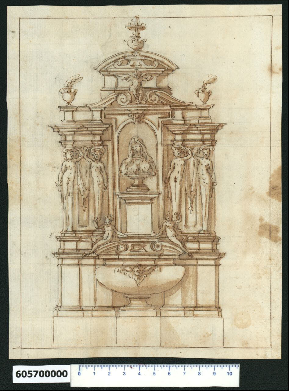 - NOTIZIE STORICO CRITICHE Nell'"Indice de due Tomi d'Intagli Tempietti ed altro", relativo ai tomi V e VI e compilato dal collezionista Giacomo Sardini, il disegno viene iscritto, insieme ad altro foglio già incollato sul lato opposto del medesimo supporto di legatura, nel paragrafo "Mausolei sepolcrali" con la definizione "139 altro simile ed altro con cariatidi".\nIl monumento funebre raffigurato sul foglio presenta una composizione simmetrica rispetto alla mezzeria. In questo caso il sepolcro poggia direttamente, sollevato solo da un piedistallo modanato interposto, sopra la sporgenza centrale dell'alta zoccolatura, su cui poggia lateralmente il basamento articolato e a due livelli che sostiene la composizione decorativa superiore.\nLa base del sepolcro, di forma arrotondata, è decorata dalla testa di un cherubino. Il coperchio è costituito da una sorta di frontone a volute contrapposte che si fronteggiano al centro inframmezzate da un piedistallo sagomato. Sopra le curve del frontone sono sedute due figure, forse angeli, che si appoggiano con una mano al piedistallo e nell'altra recano una palma.\nA livello superiore il sepolcro è vegliato dal busto di una figura femminile, probabilmente la Madonna, posto su un piedistallo sagomato appoggiato a una base rettangolare con cornice sporgente. La scultura si staglia davanti a una campitura o nicchia arcuata individuata da una cornice sagomata dagli angoli sporgenti nella parte superiore. Questa è affiancata lateralmente da due coppie di cariatidi inframmezzate da una riquadratura decorata con drappo e pendente. Mentre quelle esterne, tramite una doppia trabeazione spezzata e dalle cornici aggettanti, sostengono due urne fumanti, quelle interne allo stesso modo con un motivo ad incastro portano gli angoli aggettanti della cornice centrale e un frontone a volute che si appoggia sulla suddetta cornice. Dietro le volute che si fronteggiano ai lati di un angioletto, si compone l'elemento terminale del monumento, sovrastato da un frontone curvilineo al cui centro si staglia un piedistallo sagomato a volute che sostiene un'urna con croce trilobata.\nIl disegno, attribuito a Giovanni Battista Montano da V. Pracchi su segnalazione di A. Bedon (Pracchi, 1991 p. 19) e da L. Fairbairn (Fairbairn, 1998 vol. II, Appendix 8, p. 771), è incorniciato da una marginatura semplice e trova corrispondenza (con poche variazioni) nell'incisione n. 19 presente nella pubblicazione "Diversi ornamenti capricciosi per depositi o altari …", una raccolta di stampe basate su alcuni disegni di Montano edita da Giovanni Battista Soria nel 1625.\nLa grafia denota una esecuzione veloce, che induce a considerare il disegno una ideazione tratteggiata da Montano stesso.