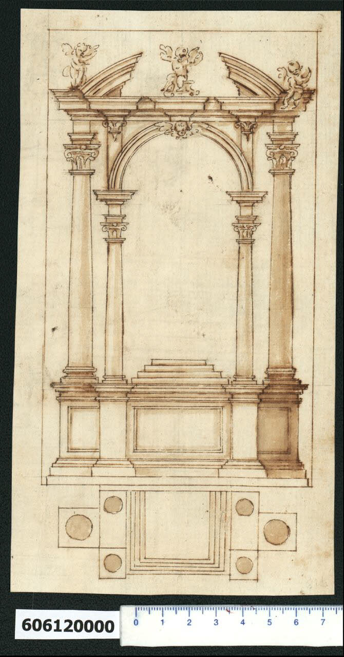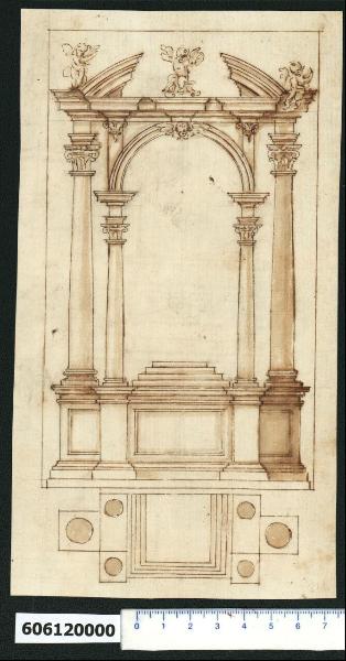 - NOTIZIE STORICO CRITICHE Nell'"Indice de due Tomi d'Intagli Tempietti ed altro", relativo ai tomi V e VI e compilato dal collezionista Giacomo Sardini, il disegno viene iscritto nel paragrafo "altari diversi" con la definizione "141 a 3 colonne e 2 ordini ...".\nIl disegno fa parte di una serie di studi per cibori, che hanno basamento simile, ma variano negli elementi compositivi della parte superiore (Milano, Collezione Sardini Martinelli invv. 6,46 R e 6,72 R). La relazione del disegno è più stretta con quello di cui all'inv. 6,46 R.\nLa raffigurazione è presentata in pianta e in prospetto, quest'ultimo inserito in una marginatura. Il basamento è costituito da una parte centrale dal frontale riquadrato, con un rialzo gradonato (piedistallo) soprastante, affiancata da due elementi che in pianta assumono la forma di T, su cui poggiano tre colonne. \nLa composizione, esaminata in alzato, rivela un doppio sistema gerarchizzato: le due colonne esterne, più alte e massicce, che sostengono due tratti di trabeazione con cornici aggettanti su cui poggiano putti alati (in piedi a sinistra e seduto a destra), inquadrano il sistema architettonico centrale costituito da una sorta di baldacchino sorretto da quattro colonne minori sulla cui trabeazione a cornice aggettante è impostato frontalmente un elemento ad arco a tutto sesto con ghiera, decorato con una testa di cherubino in corrispondenza della chiave di volta e due mensole a doppia voluta sulle lesene laterali. Il frontone curvilineo conclusivo è spezzato alla base e interrotto lungo il lato curvo per inquadrare ed esaltare il putto alato centrale seduto su piedistallo. \nIl disegno, che non è menzionato da L. Fairbairn (Italian Renaissance Drawings from the collection of Sir John Soane's Museum, 1998), è attribuito a Giovanni Battista Montano da V. Pracchi su segnalazione di A. Bedon (Pracchi, 1991 p. 19), mentre Laura Marcucci sostiene che l'esecutore è un allievo di Montano, forse Soria o Venturi. La Marcucci rileva similitudini con gli altari di S. Giuseppe dei Falegnami (la chiesa fu progettata da Montano su incarico del 1597), della chiesa della Trinità dei Pellegrini (primo sul lato destro) e il ciborio per l'altare maggiore di S. Crisogono a Roma, dove compare la medesima soluzione di figurazioni introdotte tra la trabeazione e i capitelli delle colonne sorreggenti le arcate della cupoletta (Marcucci, 2008 p. 43).