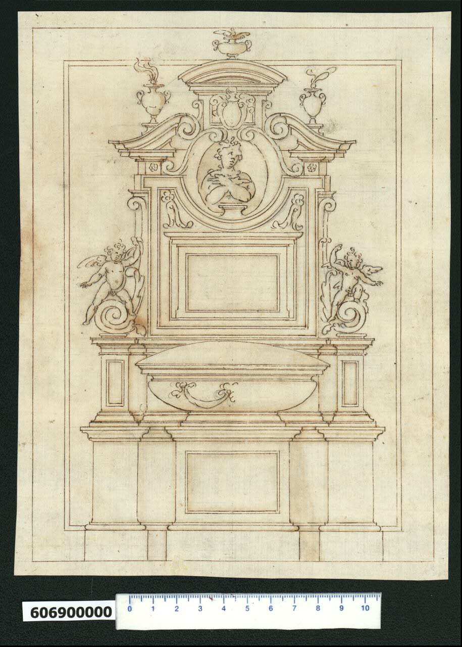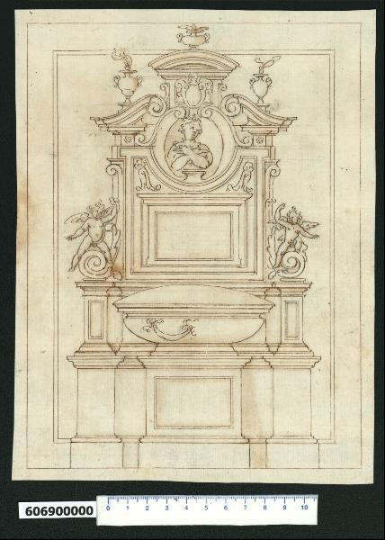 - NOTIZIE STORICO CRITICHE Nell'"Indice de due Tomi d'Intagli Tempietti ed altro", relativo ai tomi V e VI e compilato dal collezionista Giacomo Sardini, il disegno viene iscritto nel paragrafo "Mausolei sepolcrali" con la definizione "145 altro piccolo".\nIl monumento funebre raffigurato sul foglio presenta una composizione simmetrica rispetto alla mezzeria, con un alto basamento articolato in due appoggi laterali e una sorta di altare riquadrato nella parte centrale, sopra il quale è collocato il sepolcro. Quest'ultimo ha una forma arrotondata sia nella base, decorata in parte con un festone, sia nel coperchio ed è racchiuso tra i due piedritti riquadrati corrispondenti agli appoggi laterali del basamento, che sorreggono le due volute vegetali sovrastate da angeli a lato della composizione centrale. Questa si erge dalla struttura retrostante con una cornice rettangolare che presenta il lato superiore sporgente agli estremi e arcuato verso il basso nella parte centrale: nel primo caso per sorreggere con l'ausilio delle volute sottostanti e attraverso un elemento di raccordo, il frontone interrotto a volute sovrastato da urne fumanti, nel secondo caso per contenere l'ovale incorniciato da un decoro a volute contrapposte, in cui è posta su un piedistallo l'effige di una figura femminile a mezzo busto con braccia incrociate. Al centro della cornice sopra descritta è un'altra cornice rettangolare da utilizzare probabilmente per un'iscrizione, ai cui angoli superiori sono posti due pendenti vegetali. Tra le volute del frontone e sopra l'ovale, si erge l'elemento conclusivo del monumento, costituito da un riquadro sostenuto da piccole volute che reca al centro uno stemma gentilizio ed è sovrastato da un frontone curvilineo con urna fumante.\nIl disegno, attribuito a Giovanni Battista Montano da V. Pracchi su segnalazione di A. Bedon (Pracchi, 1991 p. 19) e da L. Fairbairn (Fairbairn, 1998 vol. II, Appendix 8, p. 771), è incorniciato come altri di analogo soggetto (Milano, Collezione Sardini Martinelli invv. 6,30; 6,36; 6,49; 6,60; 6,79; 6,80; 6,88; 6,93) da una doppia marginatura, di cui quella interna, a doppia linea, è tagliata in alto dall'elemento decorativo terminale (l'urna) e in basso dalla zoccolatura del basamento, che sembra poggiare sulla linea inferiore della marginatura esterna.\nLa soluzione architettonica e decorativa è sicuramente invenzione di Montano; non si ha invece certezza sull'esecutore del disegno. \nLa definizione accurata e il tratto formale che lo caratterizzano, si scostano infatti dalla spontaneità e freschezza di altri disegni di Montano. La diversità di stile potrebbe imputarsi allo scopo del disegno stesso (la vendita o la formazione di un album di repertori da pubblicare), o in quanto affidato per la stesura definitiva a un lavorante della sua bottega.\nIl soggetto può essere confrontato per alcuni aspetti comuni (figura femminile a mezzo busto con braccia incrociate interna a un ovale, cornice sottostante per iscrizione, angeli su volute laterali) con un disegno conservato nel Codice di Parigi (MS Hb, 22 - 4, f. 83 consultato nel microfilm F 9384).