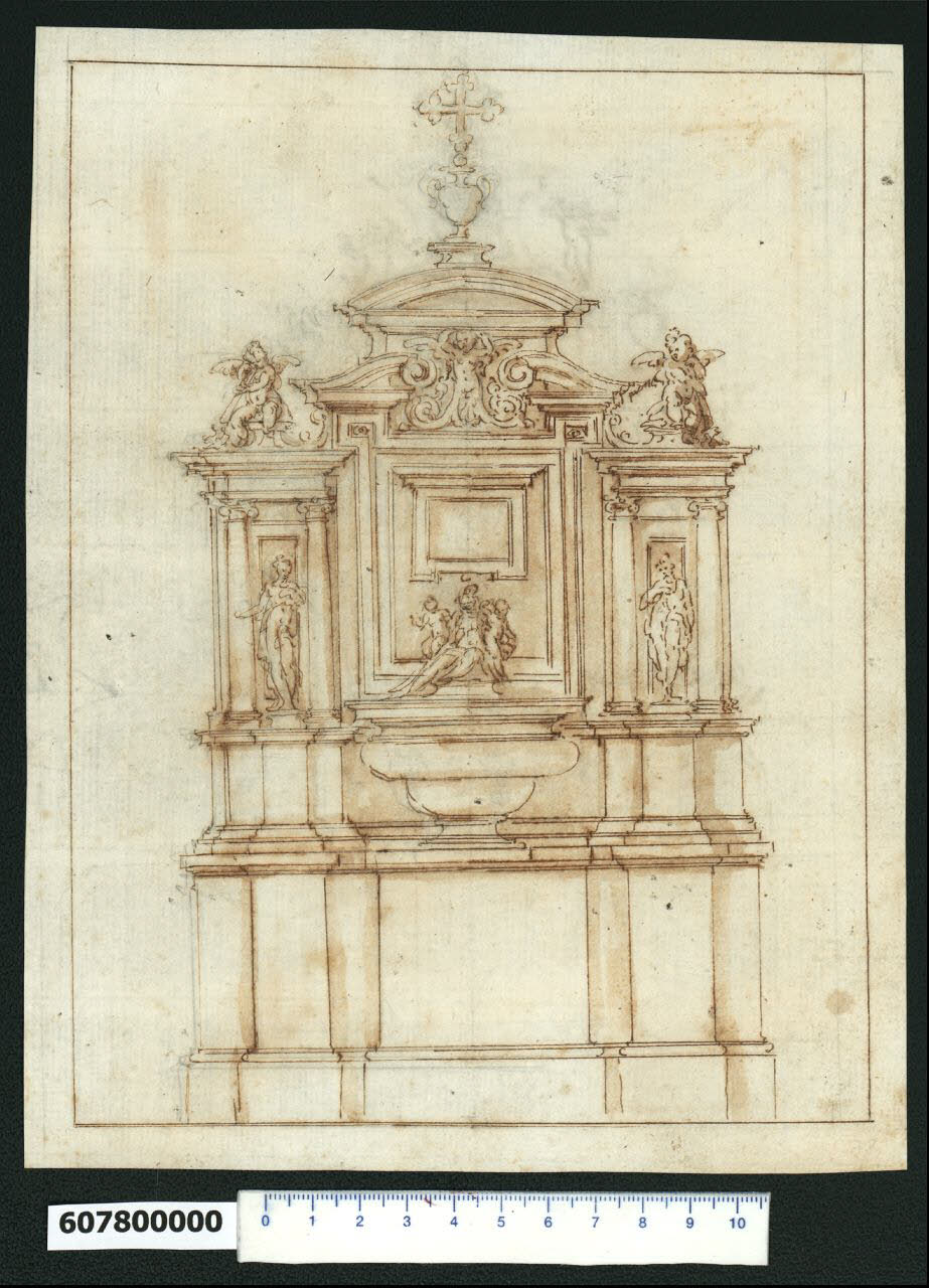 - NOTIZIE STORICO CRITICHE Nell'"Indice de due Tomi d'Intagli Tempietti ed altro", relativo ai tomi V e VI e compilato dal collezionista Giacomo Sardini, il disegno viene iscritto, insieme ad altro foglio già incollato sul lato opposto del medesimo supporto di legatura, nel paragrafo "Mausolei sepolcrali" con la definizione "150 2 altri più grandi come sopra" [come sopra si legga: a quattro colonne].\nUn'altra composizione simmetrica rispetto la mezzeria per un soggetto che ricorre tra i disegni di Giovanni Battista Montano: il monumento funebre.\nAnche in questo caso sull'elemento centrale avanzato dell'alto basamento articolato e posto su zoccolatura si eleva il sepolcro, la cui base posta su un piedistallo ha una forma arrotondata in due parti. Sopra il piano di chiusura è adagiata su un piedistallo una figura femminile affiancata da due putti, che si staglia sullo sfondo decorato da due cornici inserite l'una nell'altra, che racchiudono una riquadratura minore probabilmente da usare per un'iscrizione. A lato del putto a destra (osservando il foglio) spunta la testa di un animale, forse un orso. Dal basamento, si erge la serie articolata di supporti sagomati che regge gli elementi architettonici e decorativi laterali del monumento: due coppie di colonne ioniche inframmezzate riquadrature con statue di figure femminili drappeggiate. Le coppie di colonne sorreggono una trabeazione sul cui cornicione superiore aggettante si trovano due angioletti con tromba seduti su un piedistallo, da cui si diparte una voluta vegetale che sorregge insieme al suddetto cornicione, gli angoli superiori aggettanti e rialzati della cornice centrale più esterna. Questi ultimi sorreggono un frontone curvilineo a volute interrotto centralmente da un mezzo angelo su volute vegetali (figura che L. Marcucci sostiene in altre occasioni derivare dalla sirena emblema della famiglia Colonna), che si appoggia alla cornice e si staglia contro il supporto del frontone curvilineo terminale, su cui è posta un'urna su piedistallo con croce trilobata superiore.\nIl disegno, attribuito a Giovanni Battista Montano da V. Pracchi su segnalazione di A. Bedon (Pracchi, 1991 p. 19) e da L. Fairbairn (Fairbairn, 1998 vol. II, Appendix 8, p. 771), presenta una marginatura semplice.\nI tratti veloci e approssimativi delle figure inducono a confermare l'attribuzione del disegno allo stesso Montano.