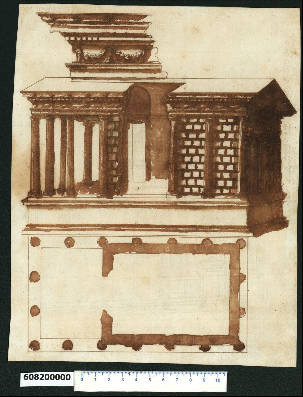 - NOTIZIE STORICO CRITICHE Nell'"Indice de due Tomi d'Intagli Tempietti ed altro", relativo ai tomi V e VI e compilato dal collezionista Giacomo Sardini, il disegno viene iscritto nel paragrafo "Tempietti" con la definizione "152 a 4 colonne di fronte".\nIl disegno è attribuito a Giovanni Battista Montano da V. Pracchi su segnalazione di A. Bedon (Pracchi, 1991 p. 20), cui rimanda L. Fairbairn (Fairbairn, 1998 vol. II, n. 1032 p. 626 e Appendix 8, p. 771).\nL'edificio raffigurato in pianta e in assonometria, con dettaglio del fregio della trabeazione, è il Tempio di Portumno, già noto come Tempio della Fortuna Virile, presentato in numerose occasioni sia da Montano sia da altri artisti del XVI secolo.\nIl piccolo tempio ionico pseudo-periptero, probabilmente dedicato a Portumnio, dio protettore del vicino porto fluviale, risale al II-I secolo a.C. e si trova sul lato nord della piazza Bocca della Verità corrispondente al Foro Boario. Presenta quattro colonne libere sul fronte e semicolonne addossate alla muratura sui fianchi e sul lato posteriore. Nell'872 divenne chiesa col nome di S. Maria Egiziaca. \nIl podio, gli angoli dell'ambiente, le colonne del pronao e l'architrave sono in travertino; il fregio, la cornice e i muri sono in tufo, mentre le decorazioni, ossia il fregio con ghirlande tra putti, candelabre e bucrani, sono realizzate in stucco (Fairbairn, 1998 vol. II, Appendix 5, pp. 738-739).\nSecondo le notizie riportate da A. Bedon, il tempio fu restaurato da Gregorio XIII e riprodotto in una tavola di Alò Giovannoli in Roma Antica (1615-19). La facciata attuale è dovuta al restauro del tempo di Clemente XI (Bedon, 1982, pp. 81-82).\nL. Fairbairn, asserisce che ci sono molti disegni rinascimentali di questo edificio e tre disegni di Montano. Questo disegno mostra l'edificio dallo stesso punto di vista con la camera voltata a botte visibile attraverso il taglio in sezione, di quello presente al Soane's Museum di Londra (Fairbairn, 1998 vol. I, n. 1032 p. 626) che riporta sul verso una scritta autografa di Montano (Bedon, 1982 p. 81). La rappresentazione è analoga a un'altra conservata nel Codice di Parigi (MS Hb, 22 - 4, f. 37 consultato nel microfilm F 9339).\nIl disegno dello stesso soggetto conservato alla Biblioteca Nazionale di Madrid (Madrid, Collezione Carerera n. B 7600), più preciso e definito, ripropone su un unico foglio ma in maniera più fedele rispetto alle rappresentazioni sopra citate, la serie di disegni illustrativi del tempio eseguiti da Palladio (Palladio, I Quattro Libri 1570, libro IV, cap. XIII, pp. 48-52).\nEsso mostra infatti la pianta completa della gradinata di accesso, una vista frontale con mezza facciata e mezza sezione trasversale e una sezione longitudinale attraverso la stanza, coperta da una volta a botte e il portico con volta emisferica inclusa nella copertura a falde. Sulla copertura e sui basamenti che racchiudono la scalinata sono disposte statue di figure drappeggiate (non presenti negli altri disegni). A lato sono rappresentati in scala maggiore i dettagli del fregio e del capitello.\nI disegni di Montano servirono per la pubblicazione delle incisioni di C. Ferrante con il titolo Raccolta de' Tempii et Sepolcri disegnati dall'antico, Roma, 1638. \nLa didascalia che accompagna l'incisione, si ispira in maniera diretta ai commenti di Palladio sul tempio stesso, riguardo i particolari, le misure e la disposizione del capitello ionico (non rappresentato tuttavia sia nei disegni sia nell'incisione) nelle colonne d'angolo utilizzate dallo stesso Palladio nella Basilica di Vicenza e nella villa Barbaro a Maser.\nSi citano per ulteriori confronti un altro disegno di Antonio da Sangallo il Giovane conservato agli Uffizi (Firenze, Uffizi n. 1166r/A) e quello di Sallustio Peruzzi (Firenze, ibidem n 689v/A e 664r/A) riprodotti da Bartoli, figg. 551, 655 e 678.\nUna bibliografia del monumento e indicazioni su altre rappresentazioni rinascimentali di anonimi e autori seguenti (Ferrante, Dosio, Alberto Alberti, Piranesi) sono menzionate in L. Fairbairn,1998 vol. II, n. 1032 p. 626 e Appendix 5, pp. 738-739.